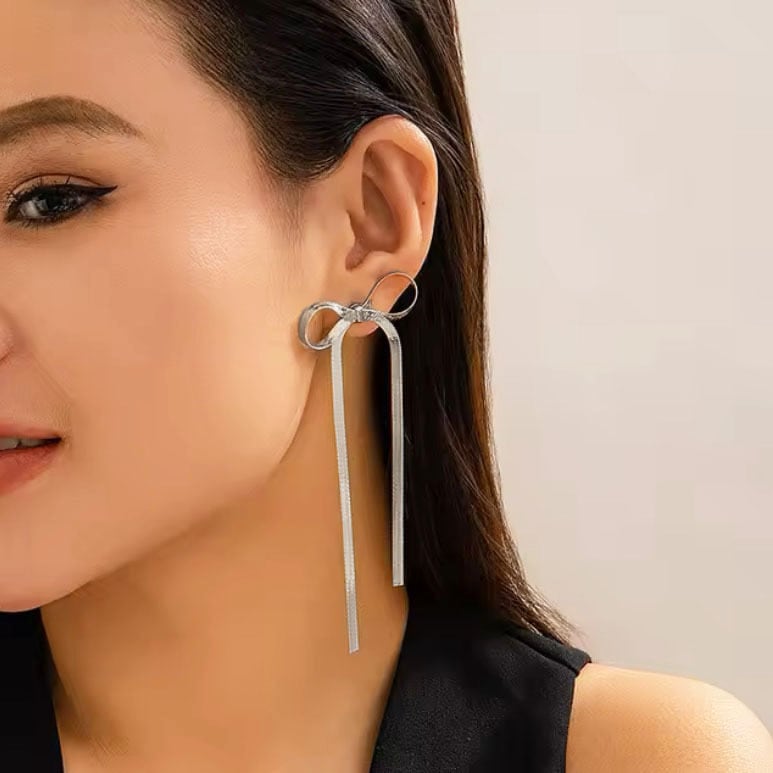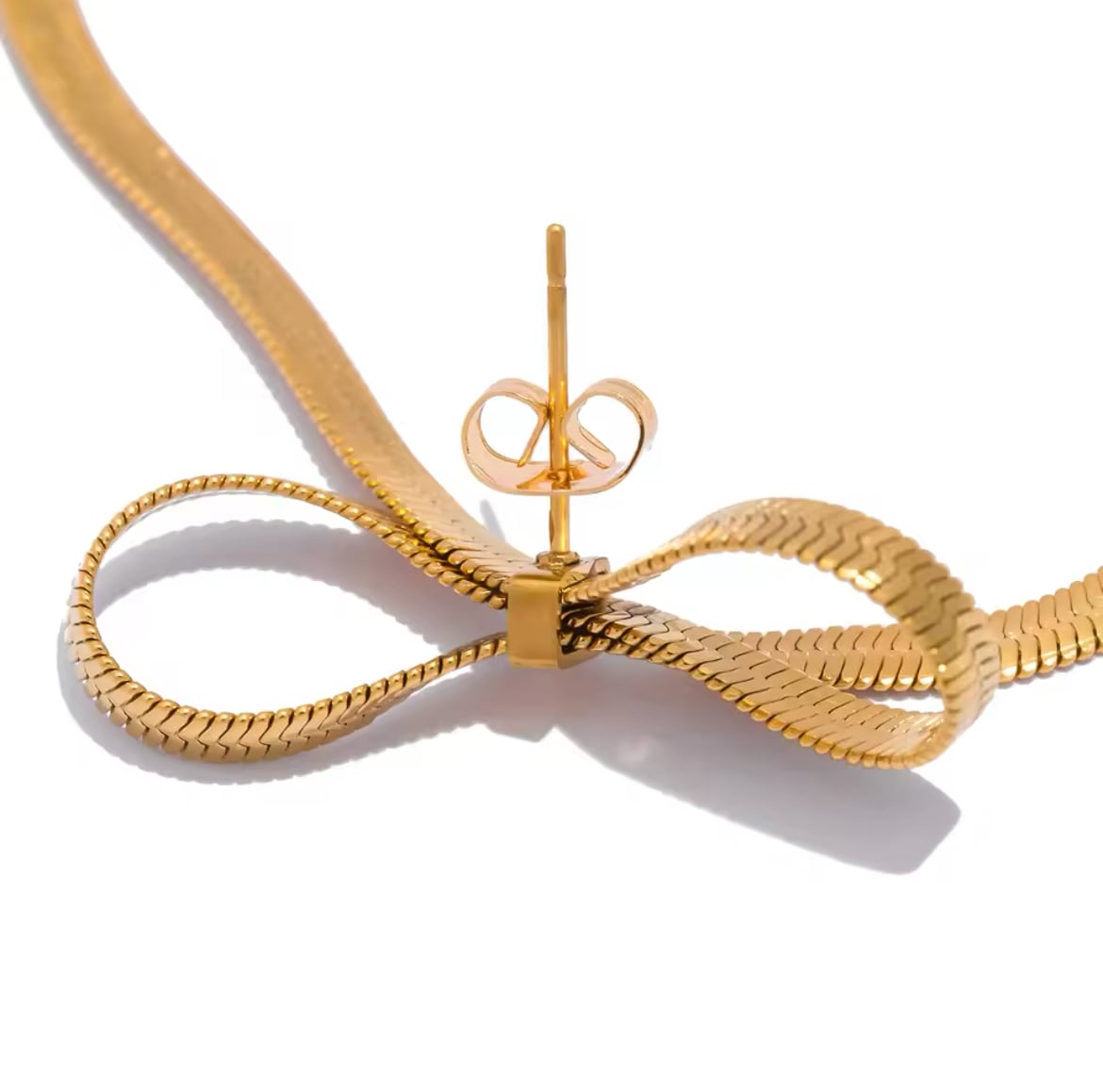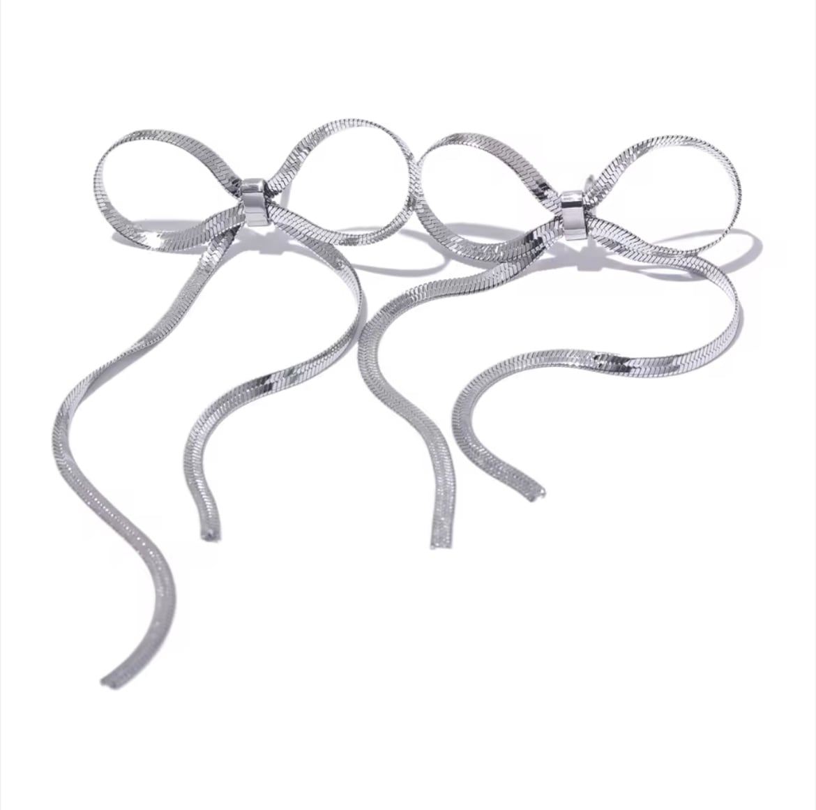チェーンリボンのステンレスピアス。立体的でゆらゆら揺れて動きのある甘すぎないリボンのデザインです。長めのチェーンが女性らしく魅力的なピアス。カジュアルなファッションにもおすすめです!