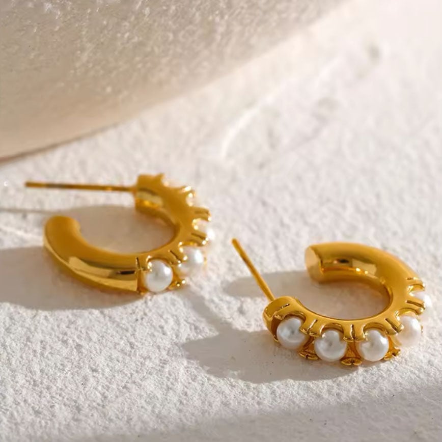 小ぶりパールのフープステンレスピアス。イミテーションパールが5粒あしらわれた大人っぽいデザイン。シンプルだけど印象的なピアスです。