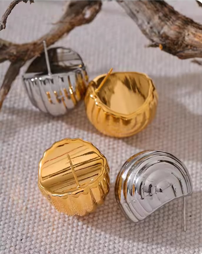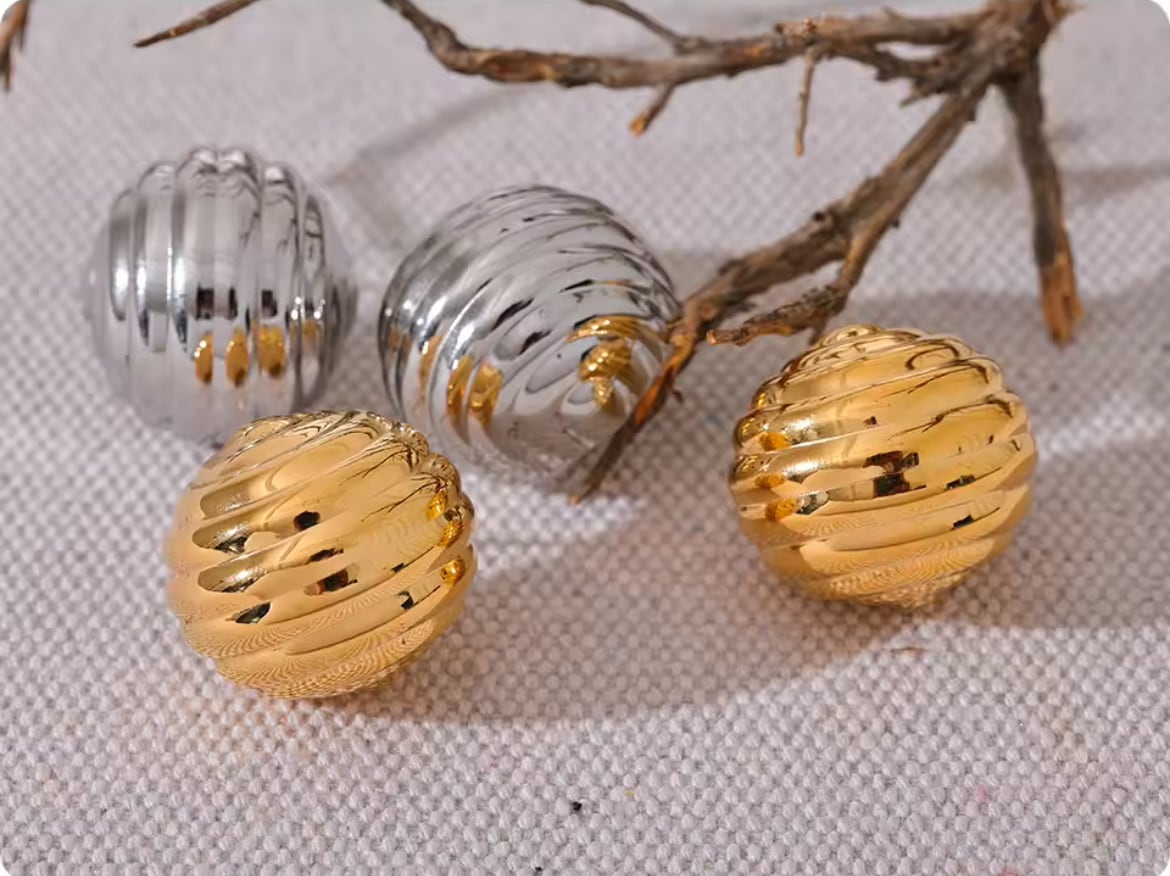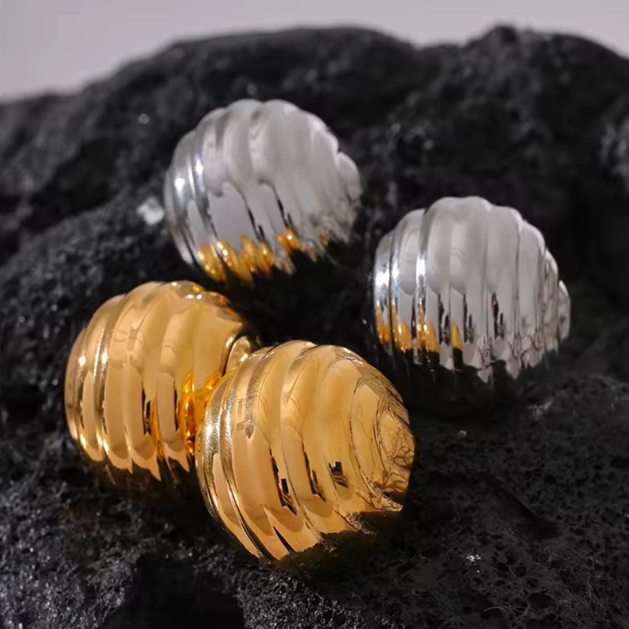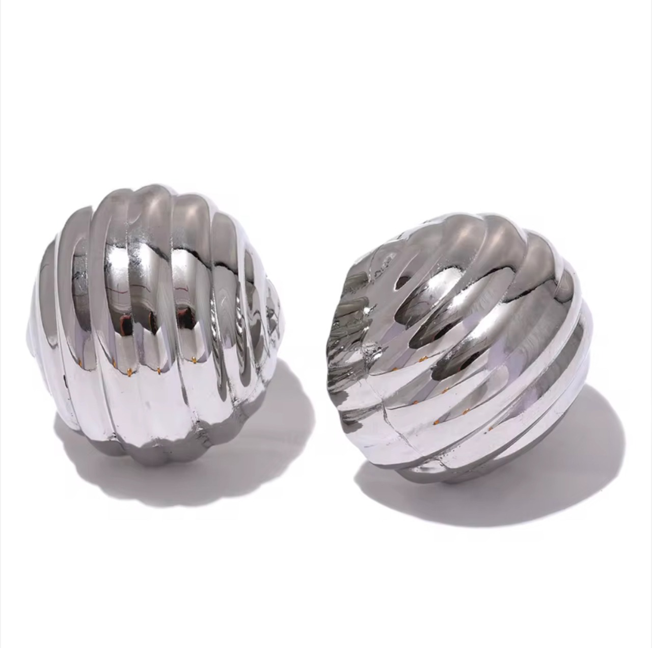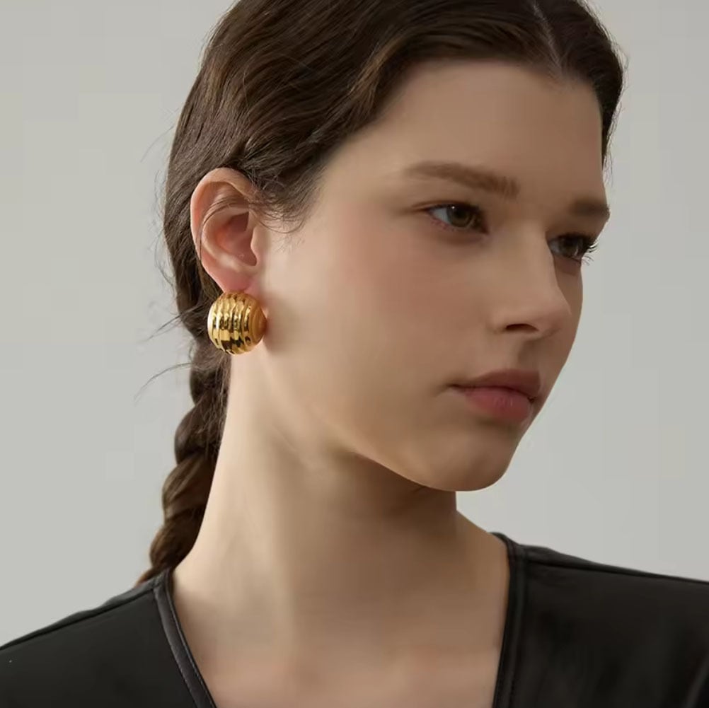 前から見るとコロンと丸く見えるステンレスピアス。耳たぶを覆うようなデザインで、おしゃれで可愛い印象です。サイズは大きすぎず、小さすぎず、とても付けやすい大きさです。