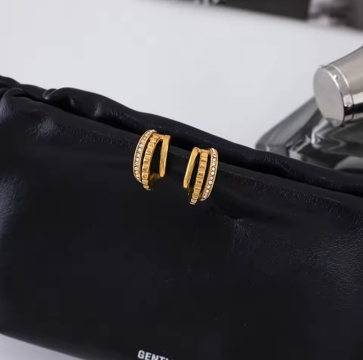 片側には繊細なストーンをあしらい、もう一方にはエッジの効いたディテールを施すことで、耳元に奥行きと華やかさをプラスします。