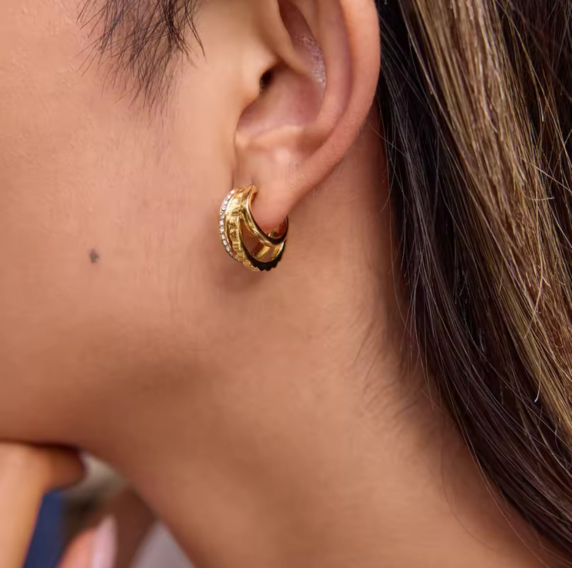 異なる表情のフープを重ねた、立体感のあるデザインピアス。