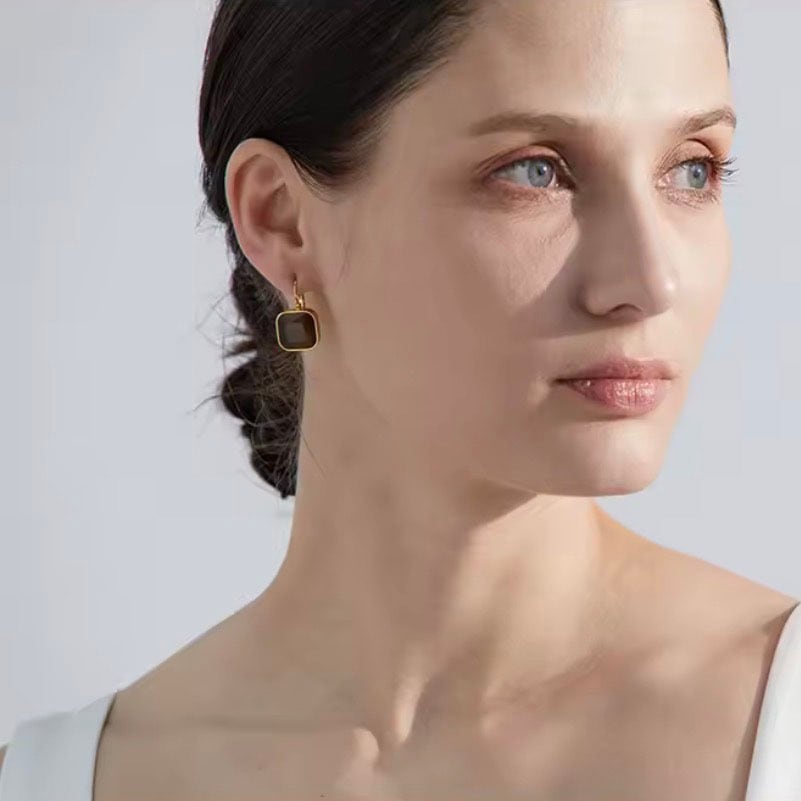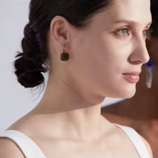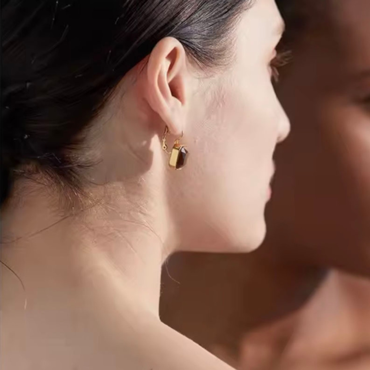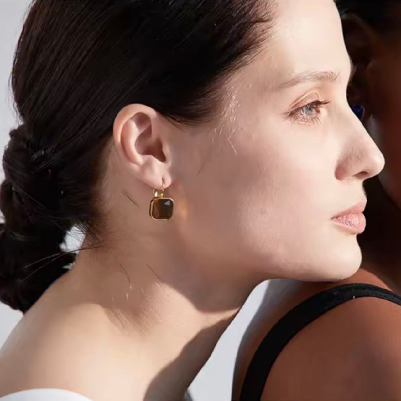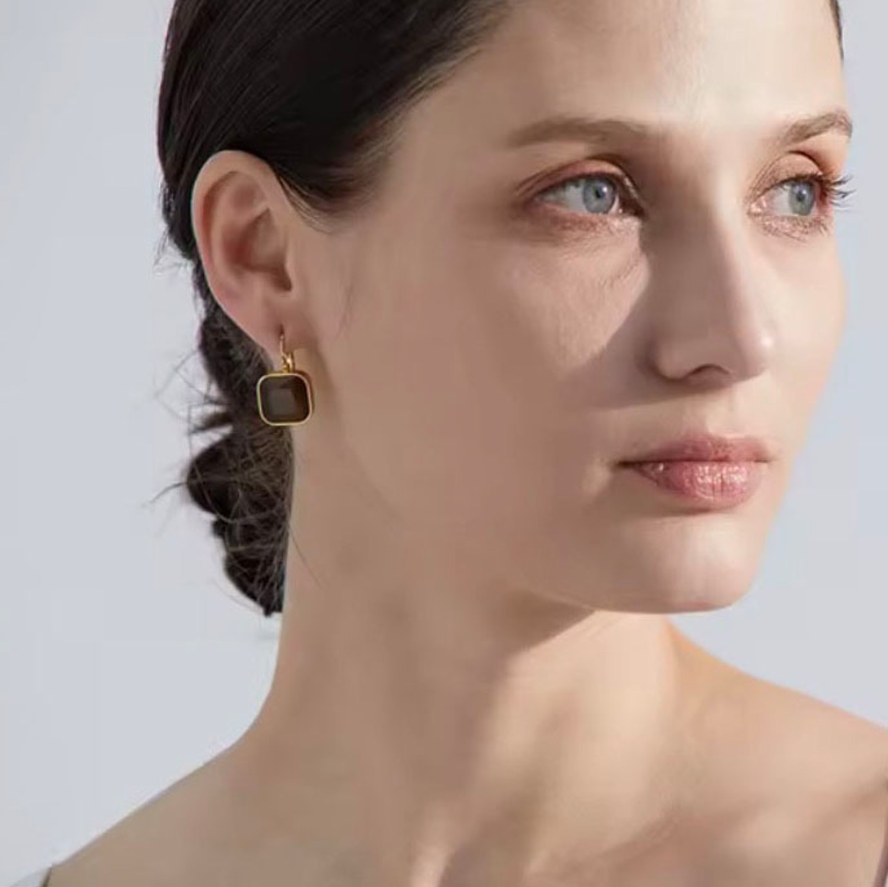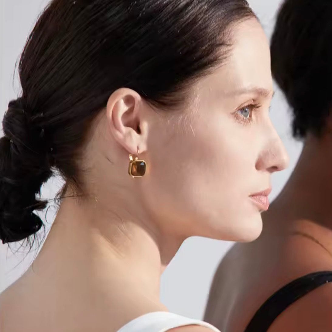 角を落としたスクエアフォルムが、耳元に洗練された印象を与えます。
