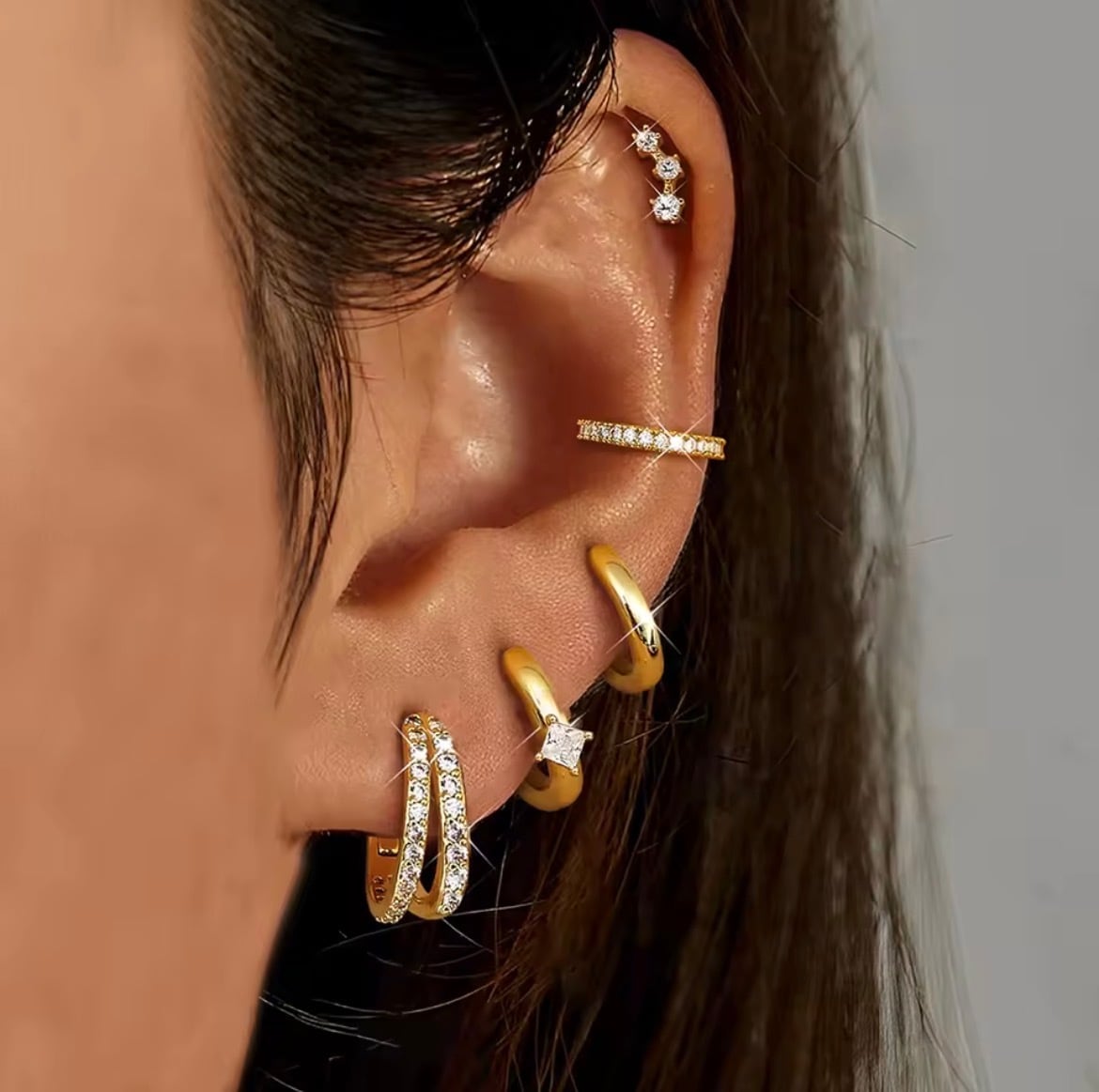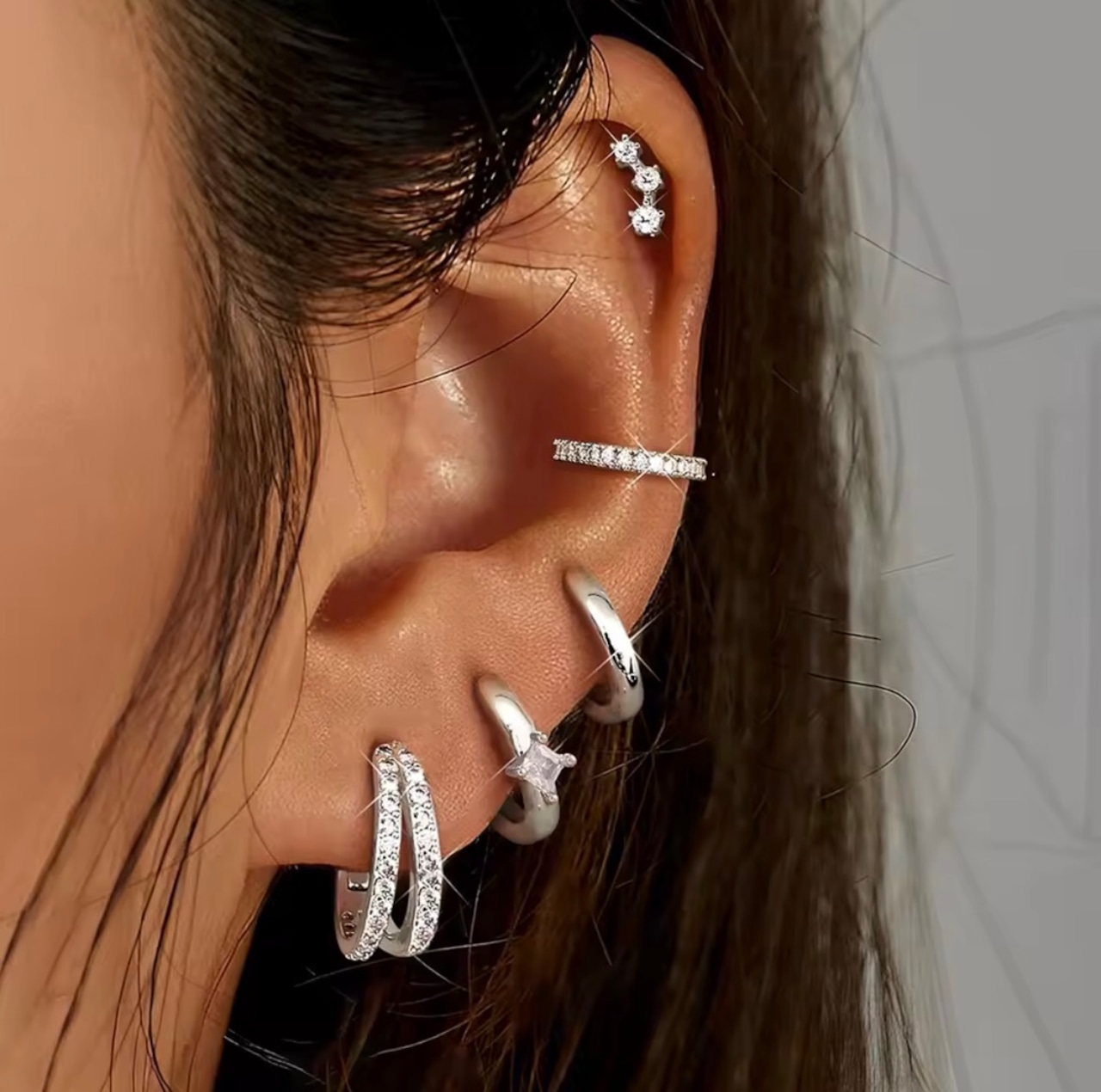 サイズやデザインの異なるピアスを組み合わせ、重ね付けや片耳使いなどアレンジも自在です。