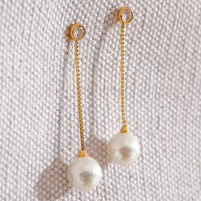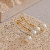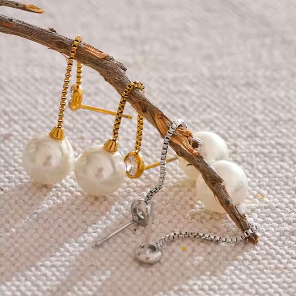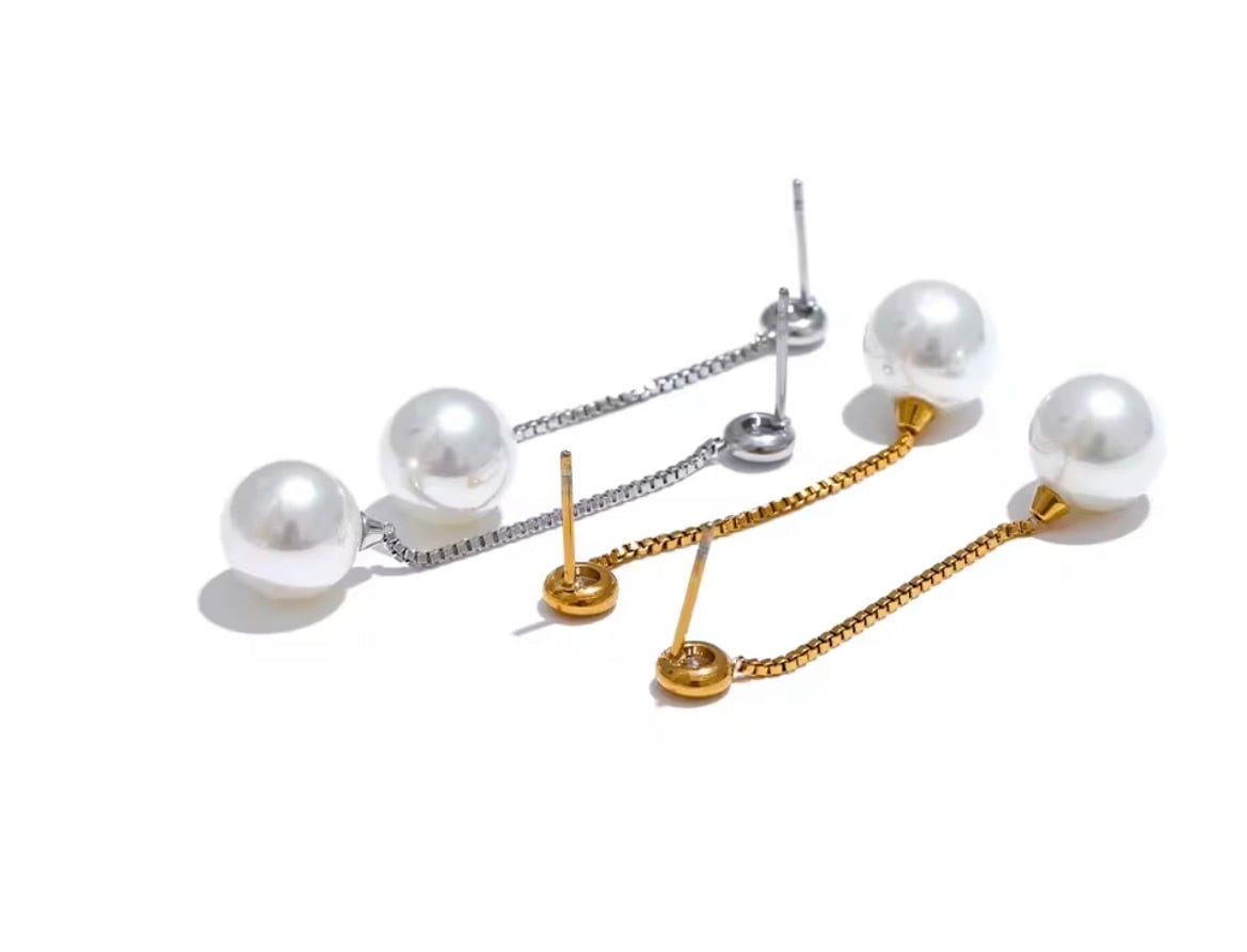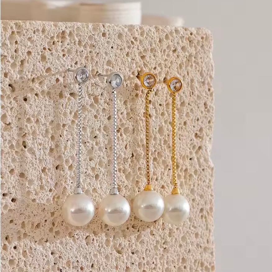 繊細なゴールドチェーンの先に、上品な艶を放つパールをあしらったロングピアス。