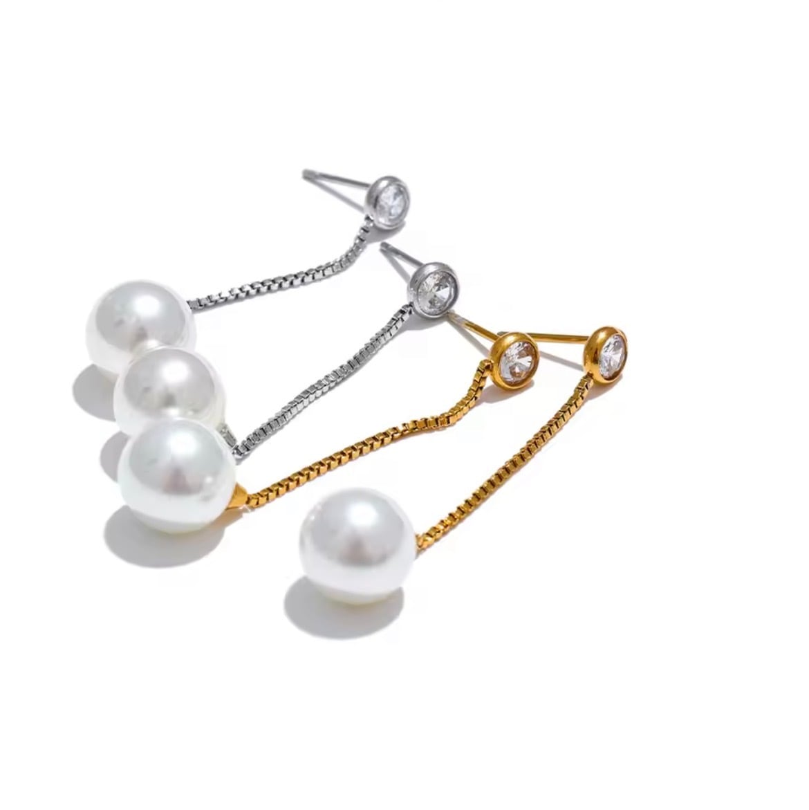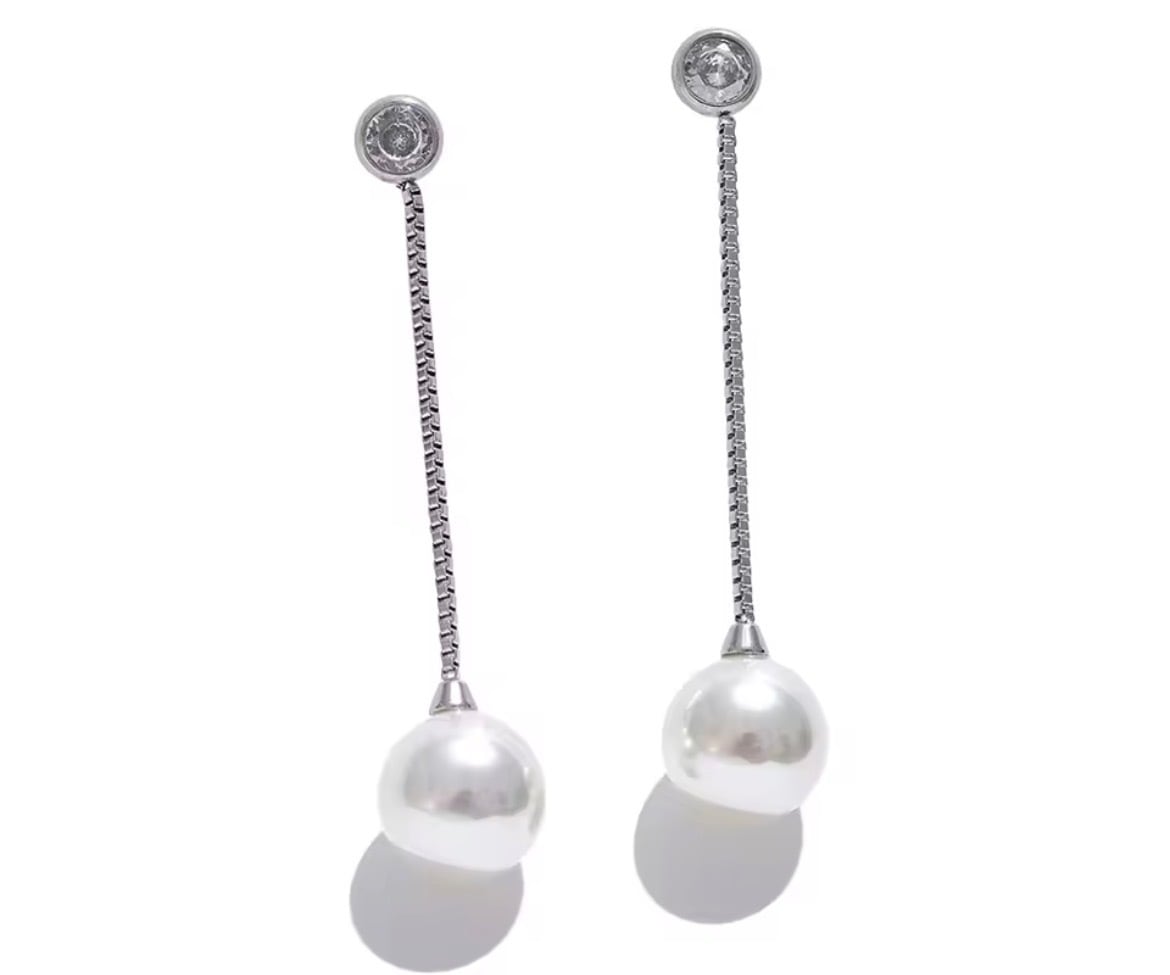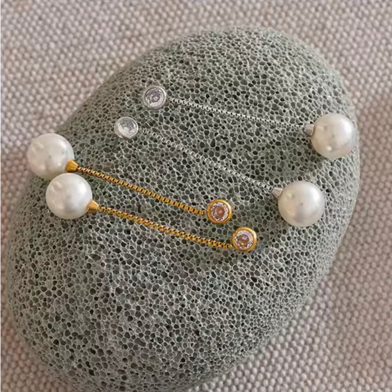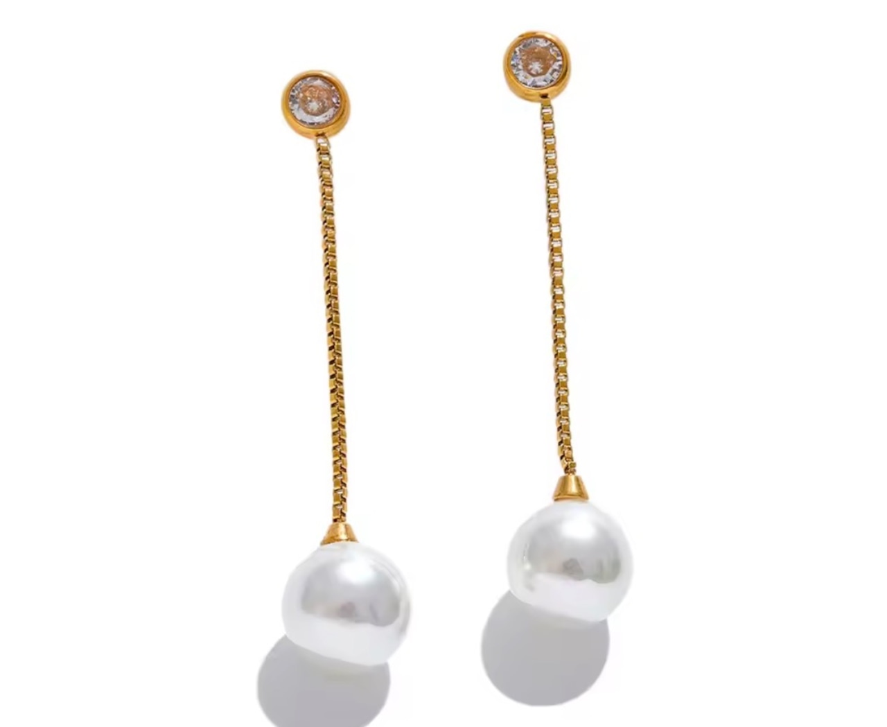 繊細なゴールドチェーンの先に、上品な艶を放つパールをあしらったロングピアス。