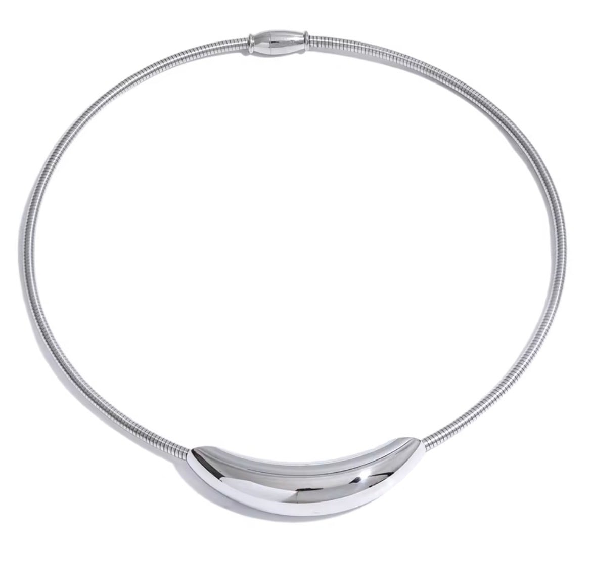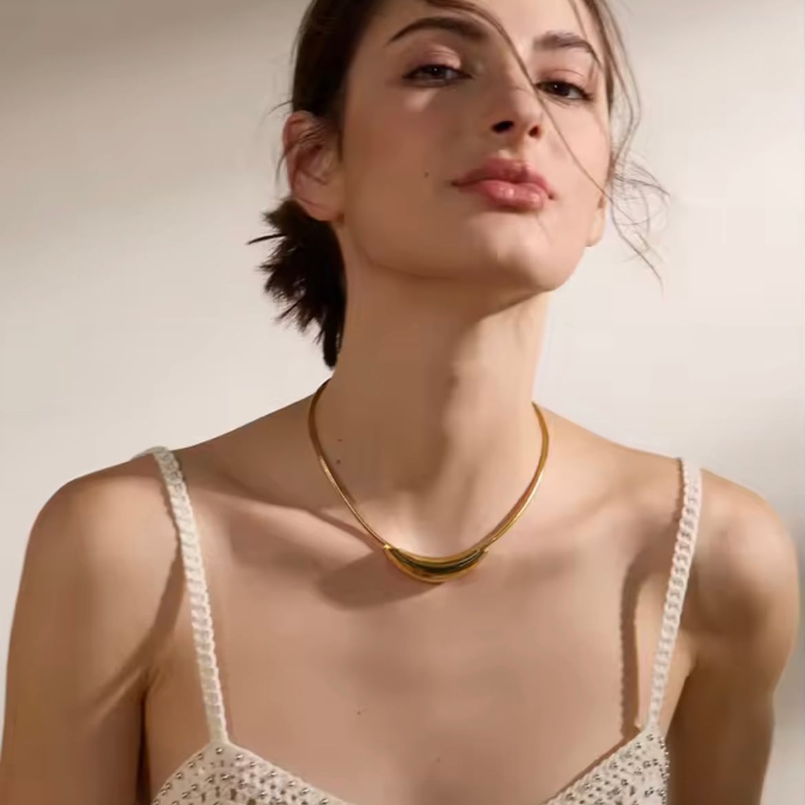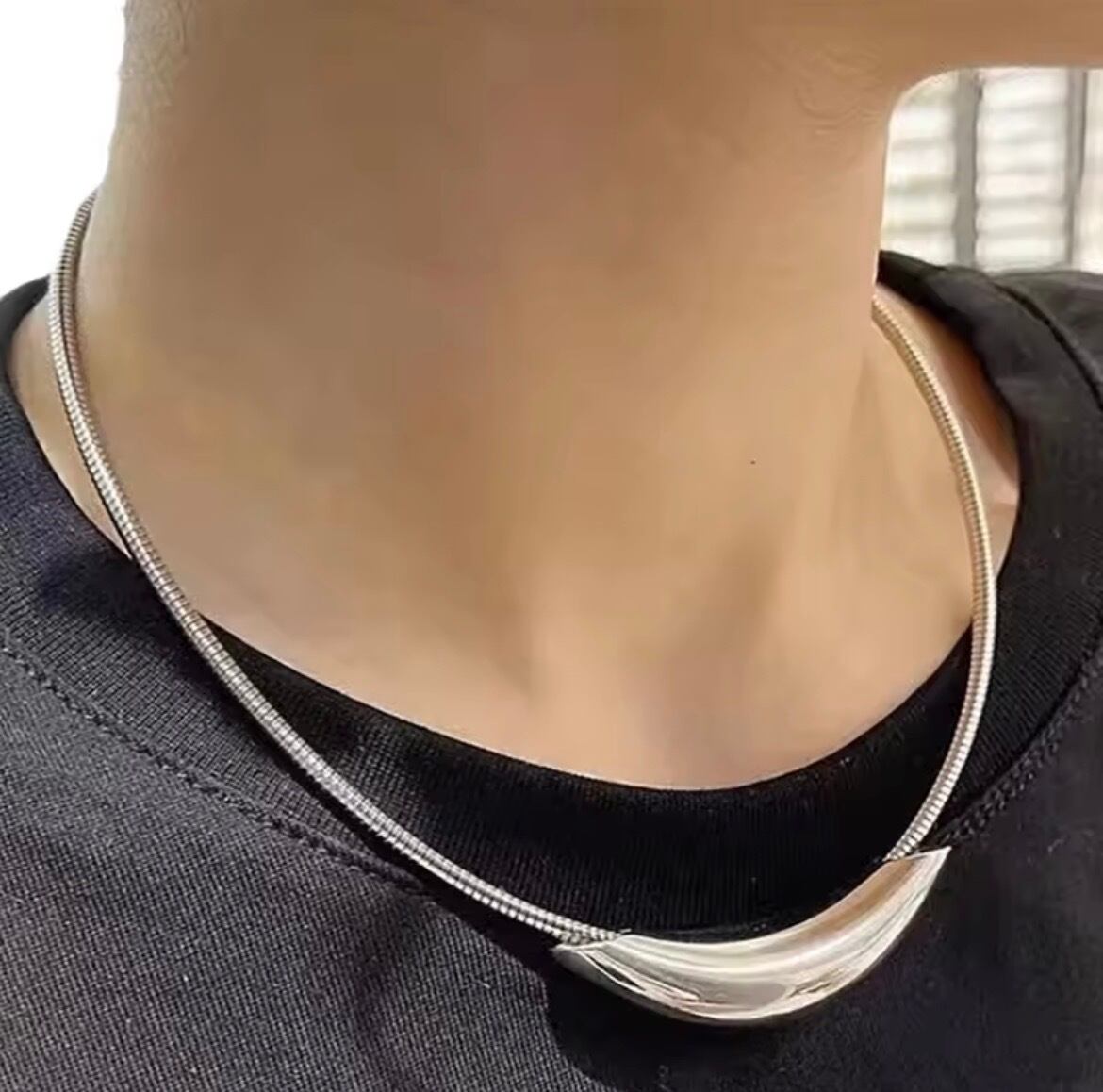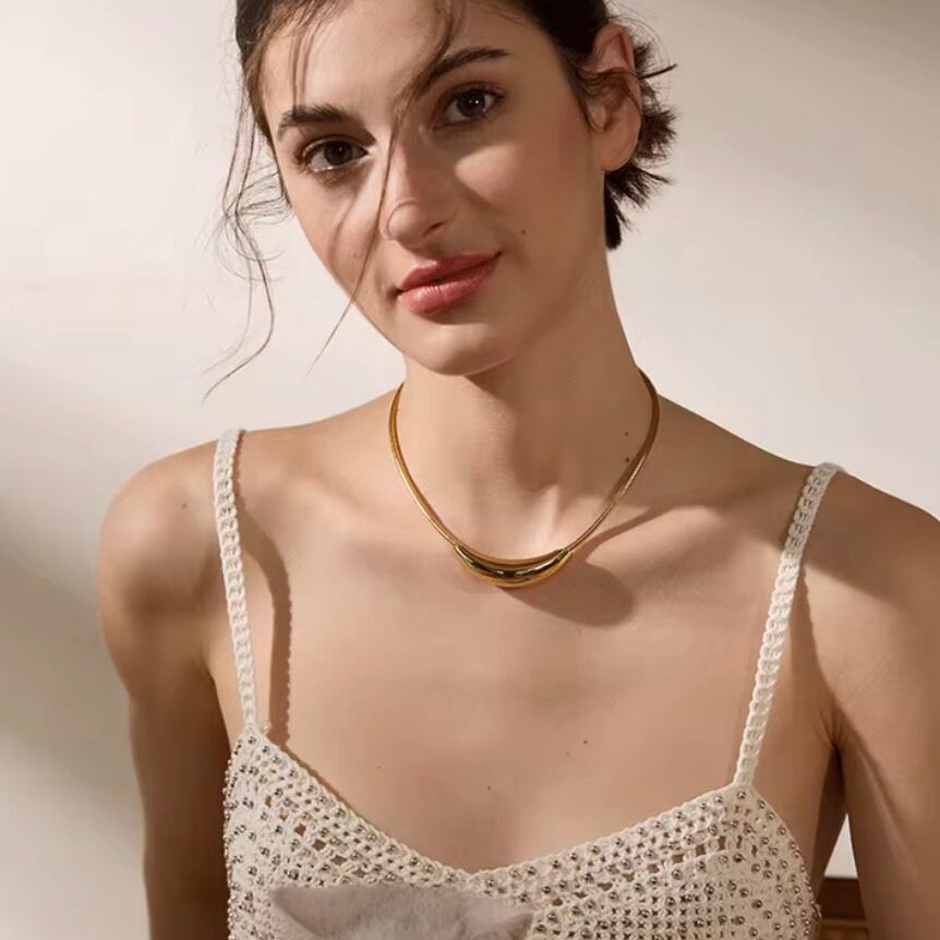 なめらかなフォルムのトップがデコルテに沿い、シンプルながらも上品な存在感を放ちます。程よいボリューム感で、コーディネートにさりげない高級感をプラス。