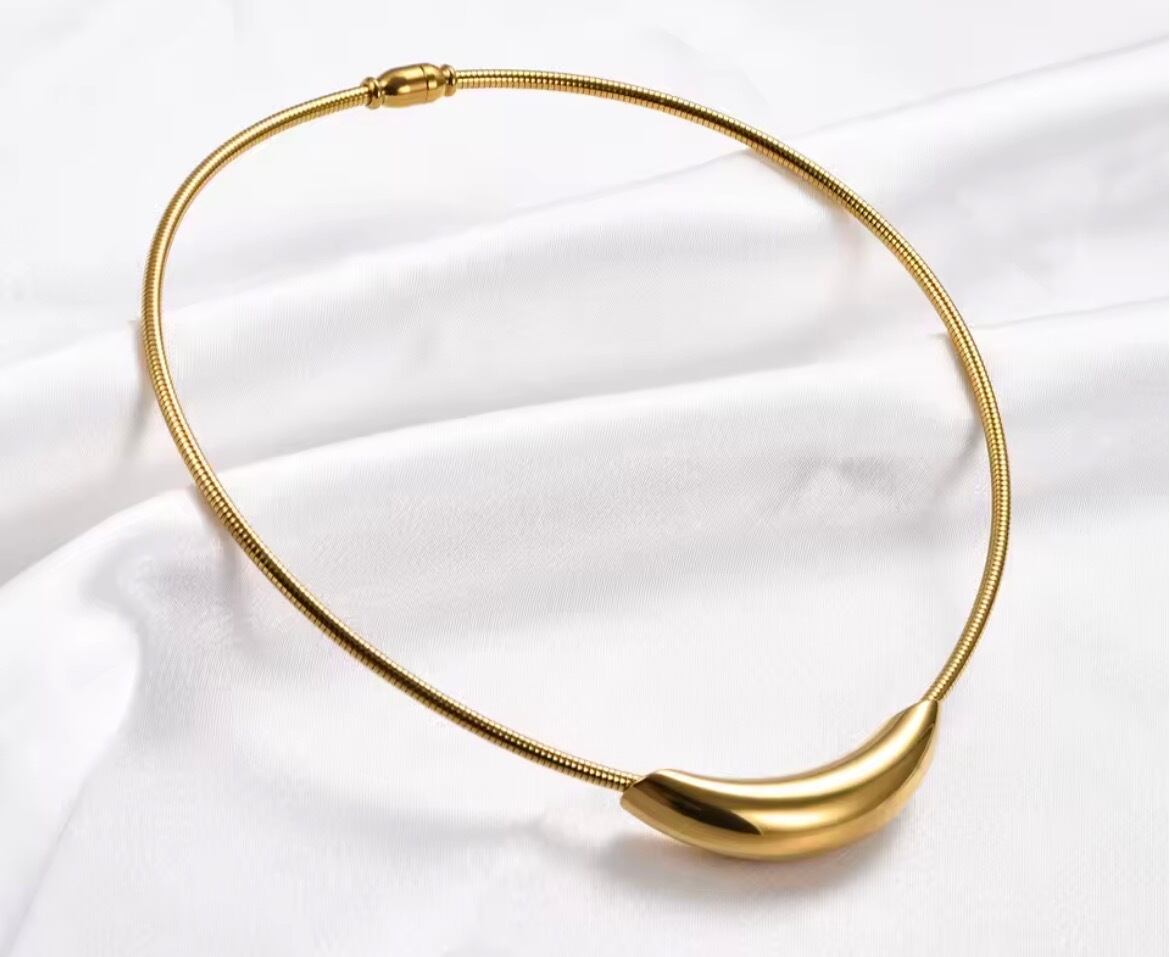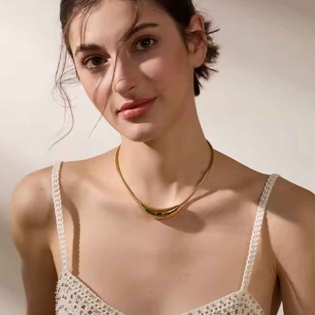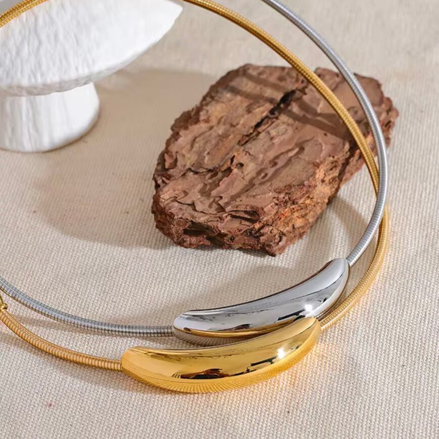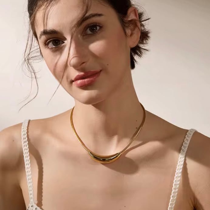 なめらかなフォルムのトップがデコルテに沿い、シンプルながらも上品な存在感を放ちます。程よいボリューム感で、コーディネートにさりげない高級感をプラス。