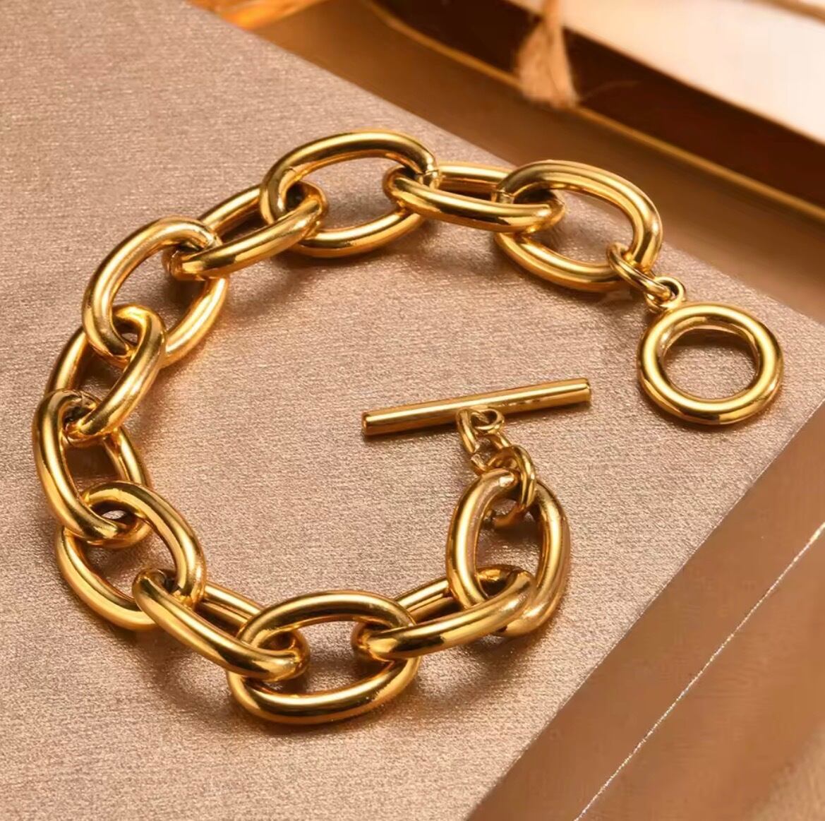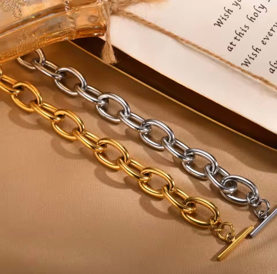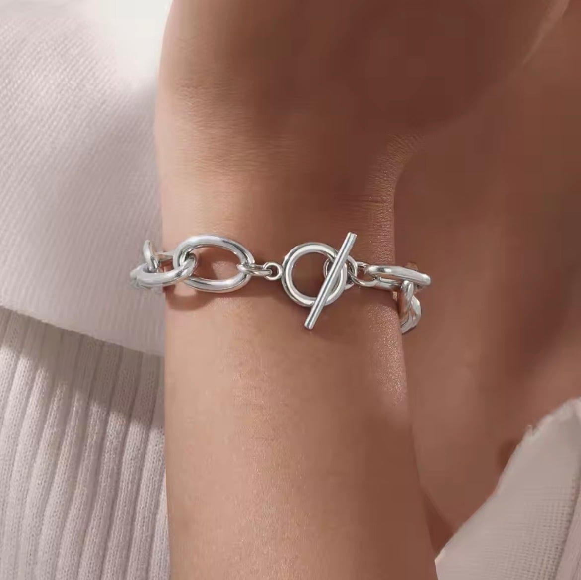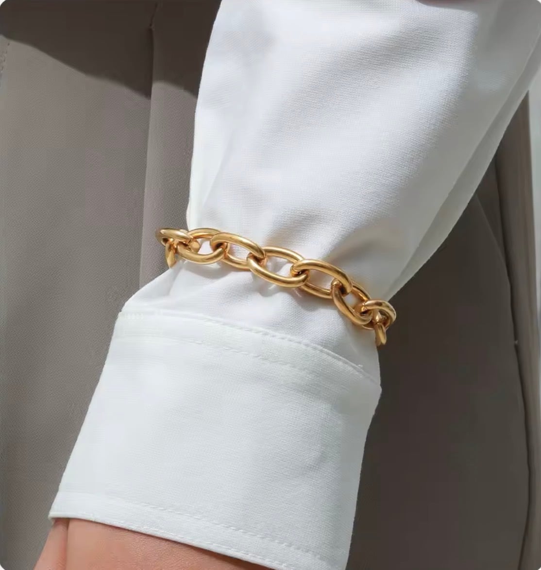 手元にしっかりとした存在感を与える、ボリュームチェーンブレスレット。
