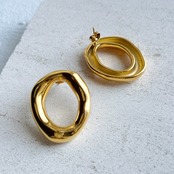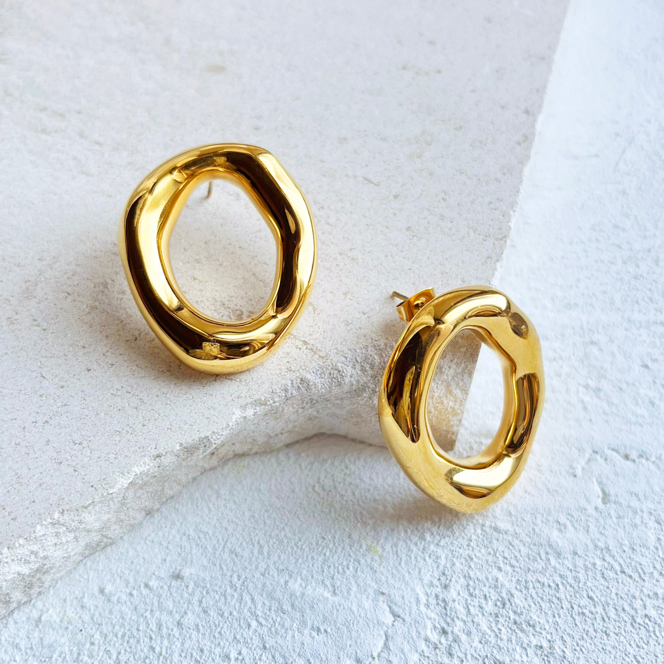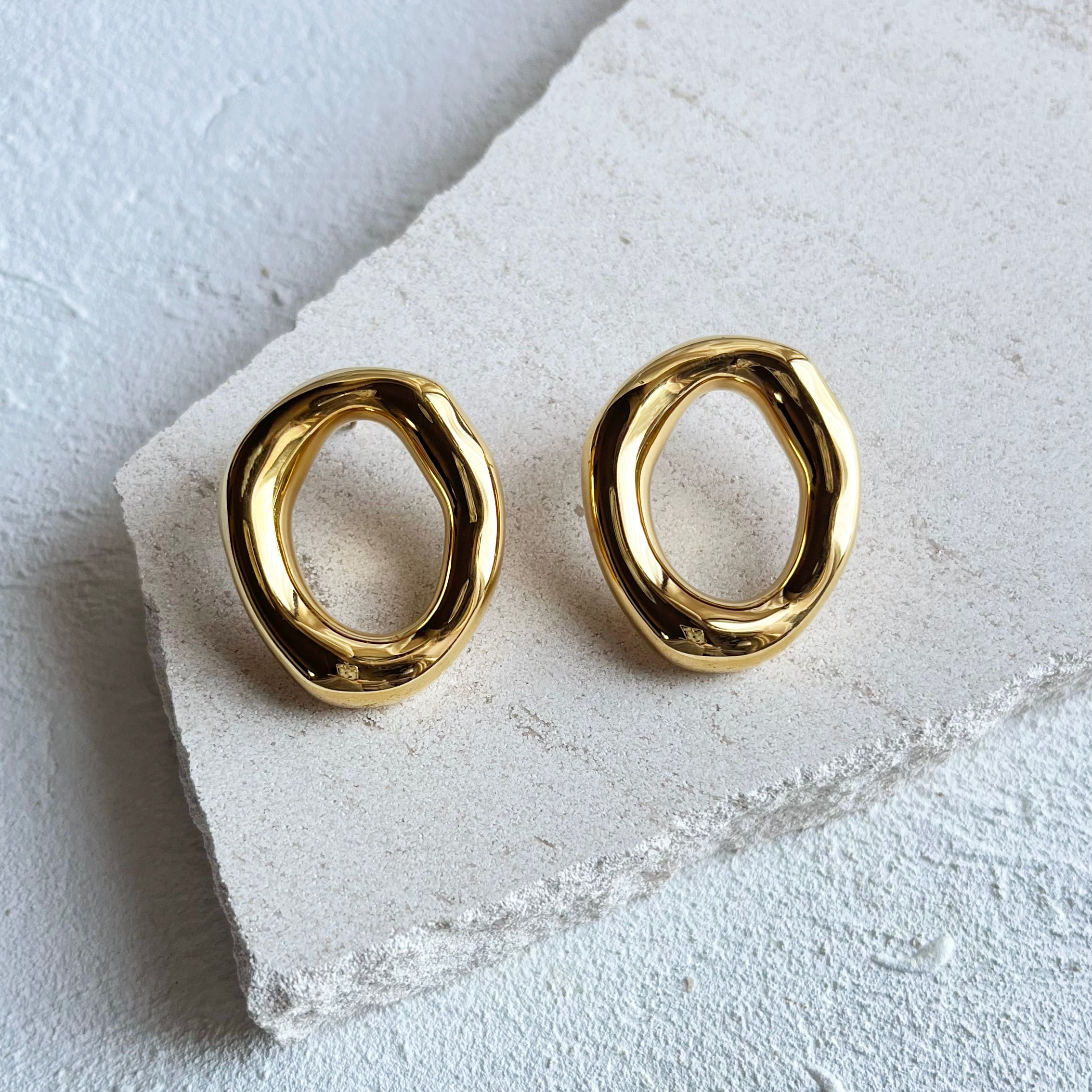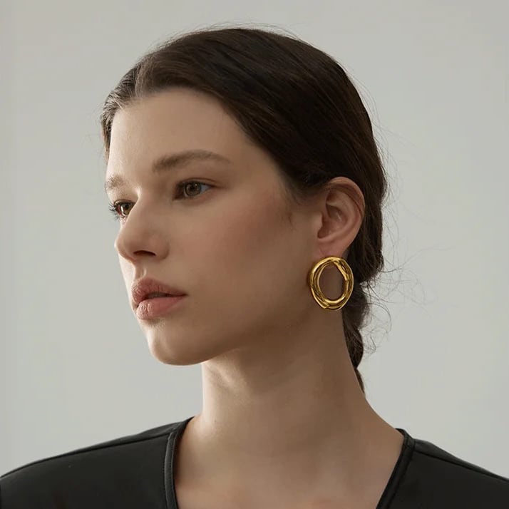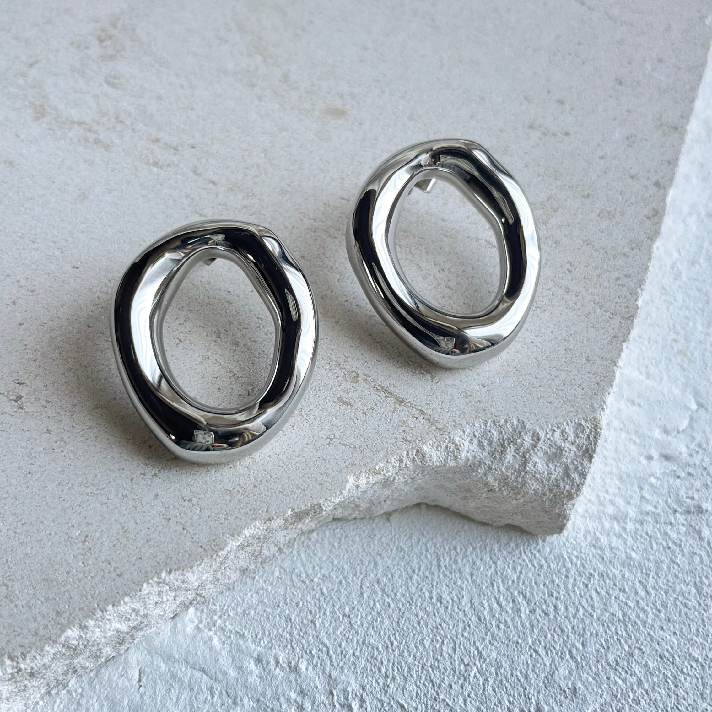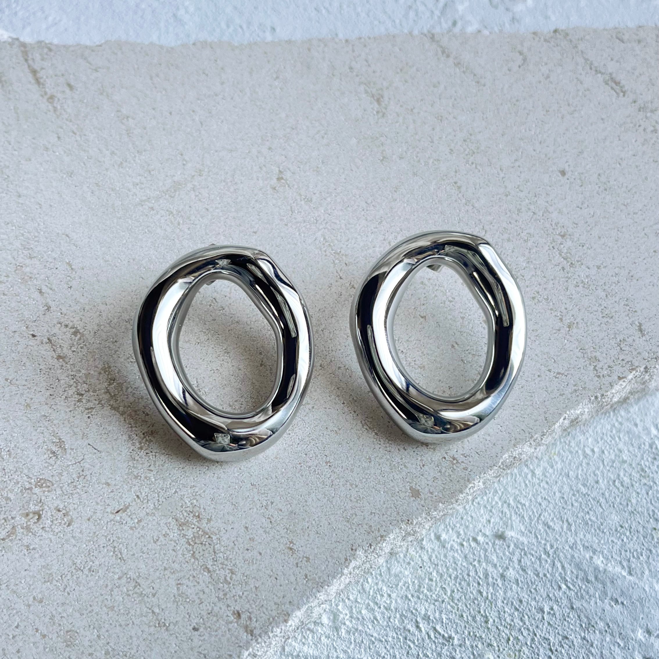 印象的なボリュームのあるステンレスピアス。形はオーバルでシンプルだけど、存在感があってレディに仕上がる好印象なアイテム。