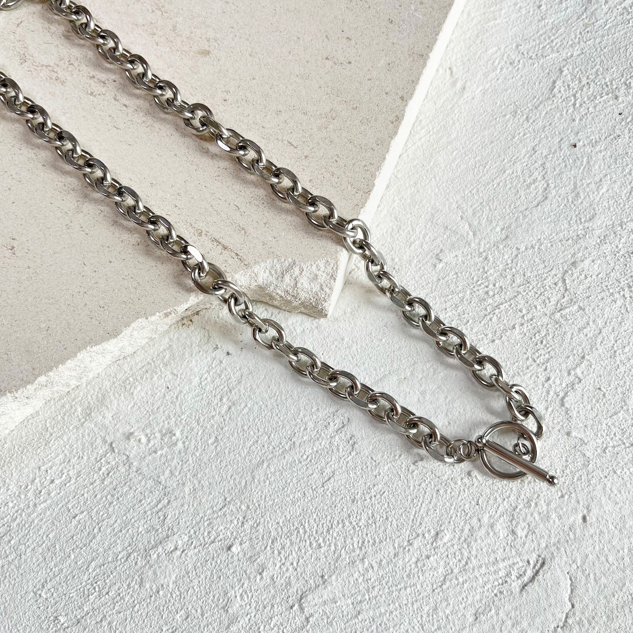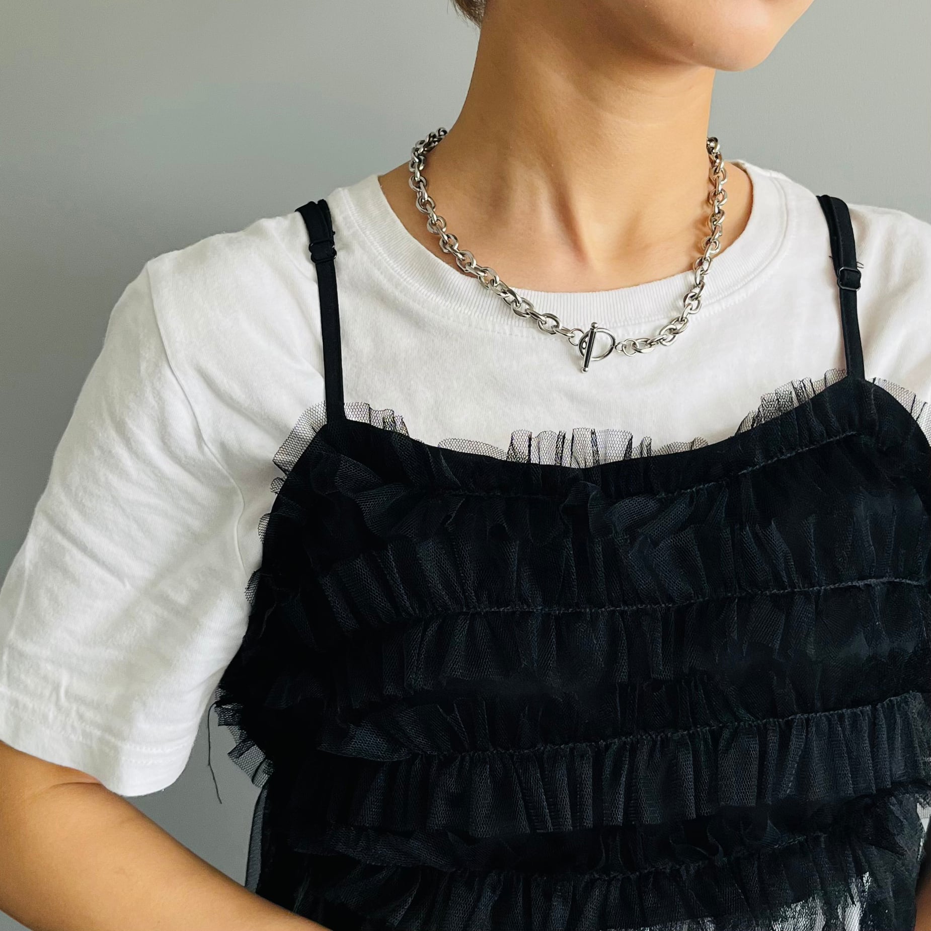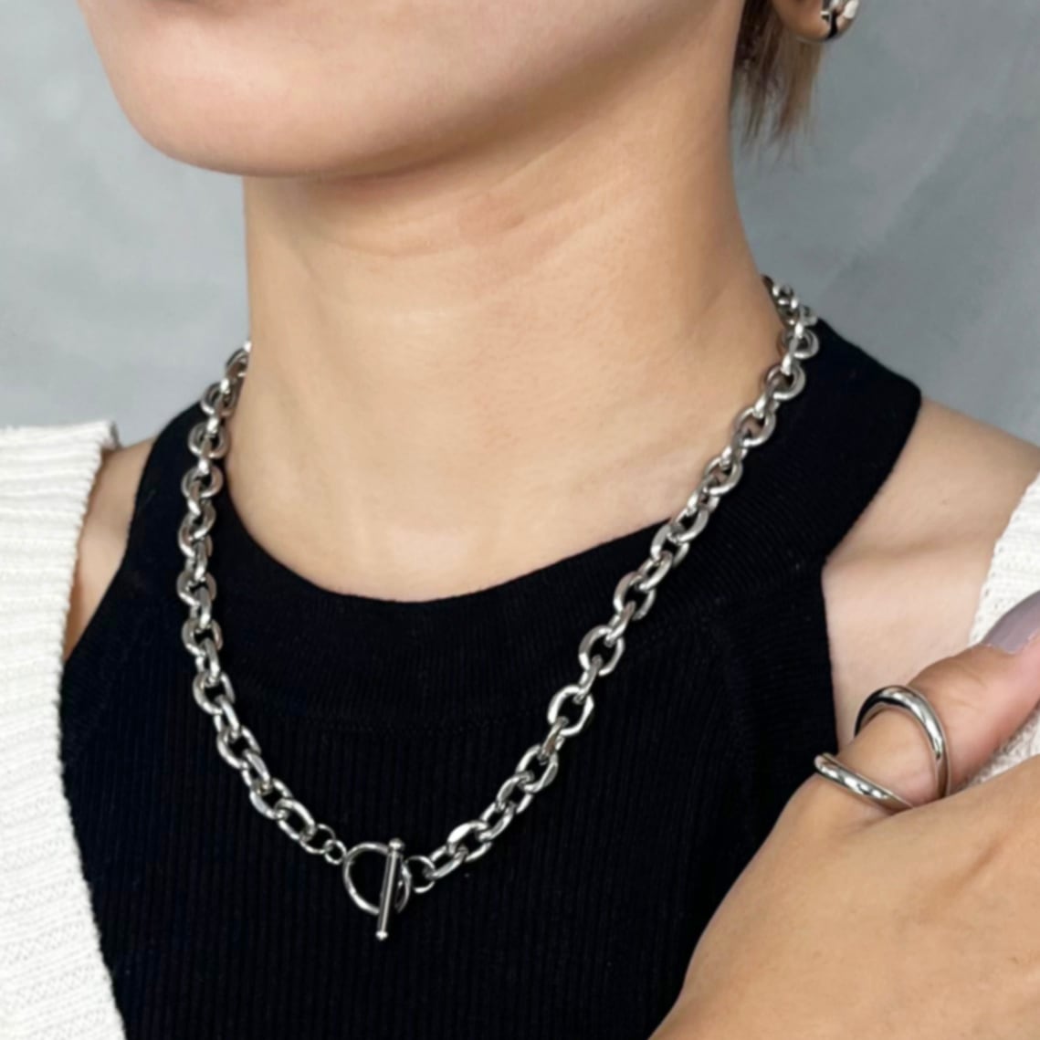 ボリュームのあるステンレスネックレス。チェーンの太さが丁度よく、どんなファッションにも合う万能デザイン。