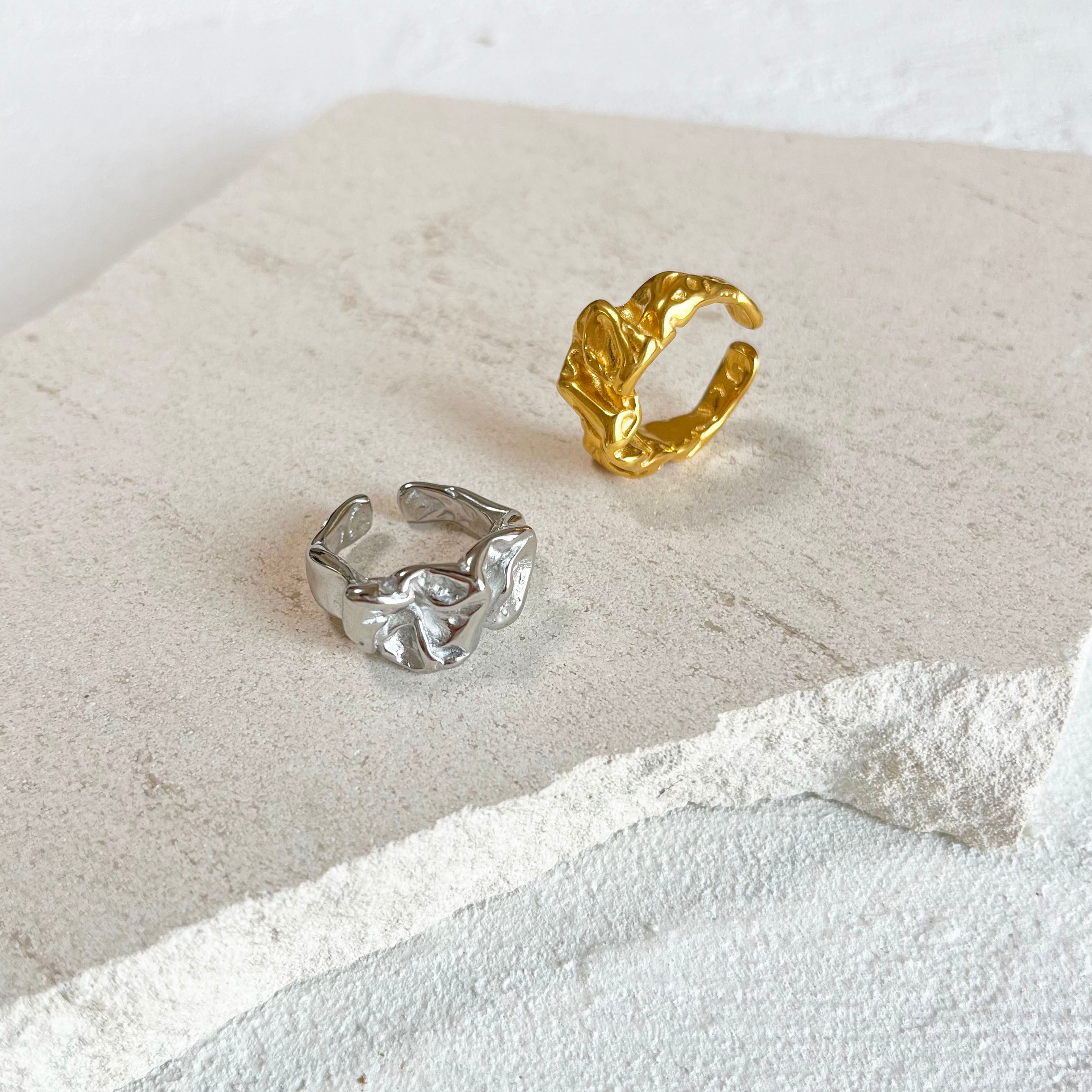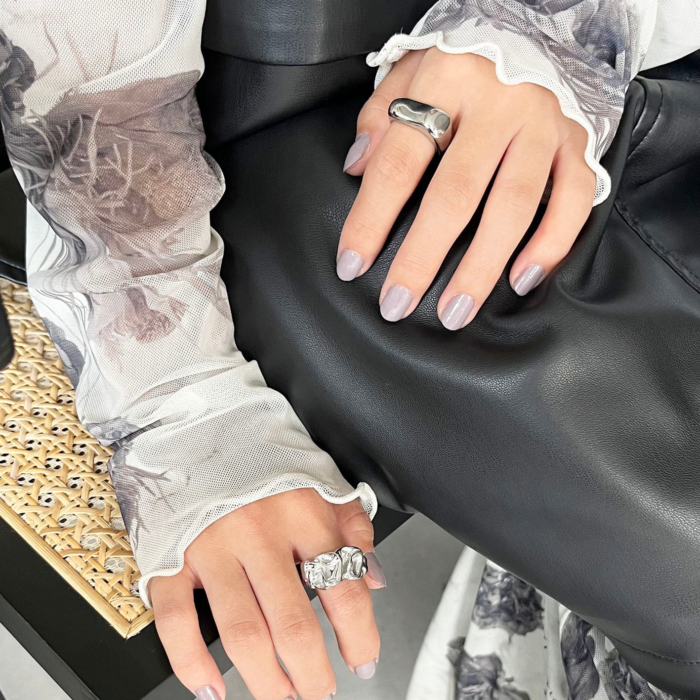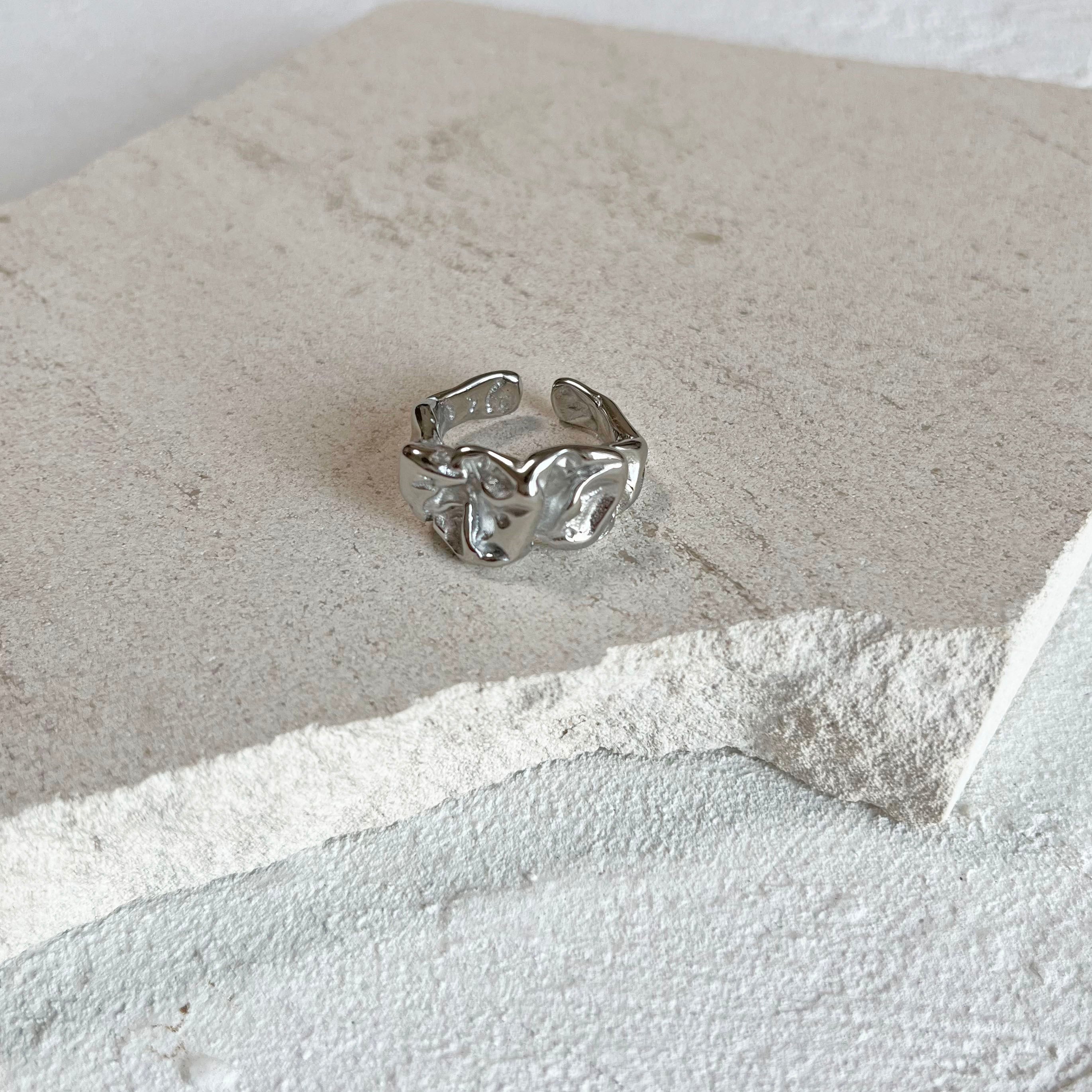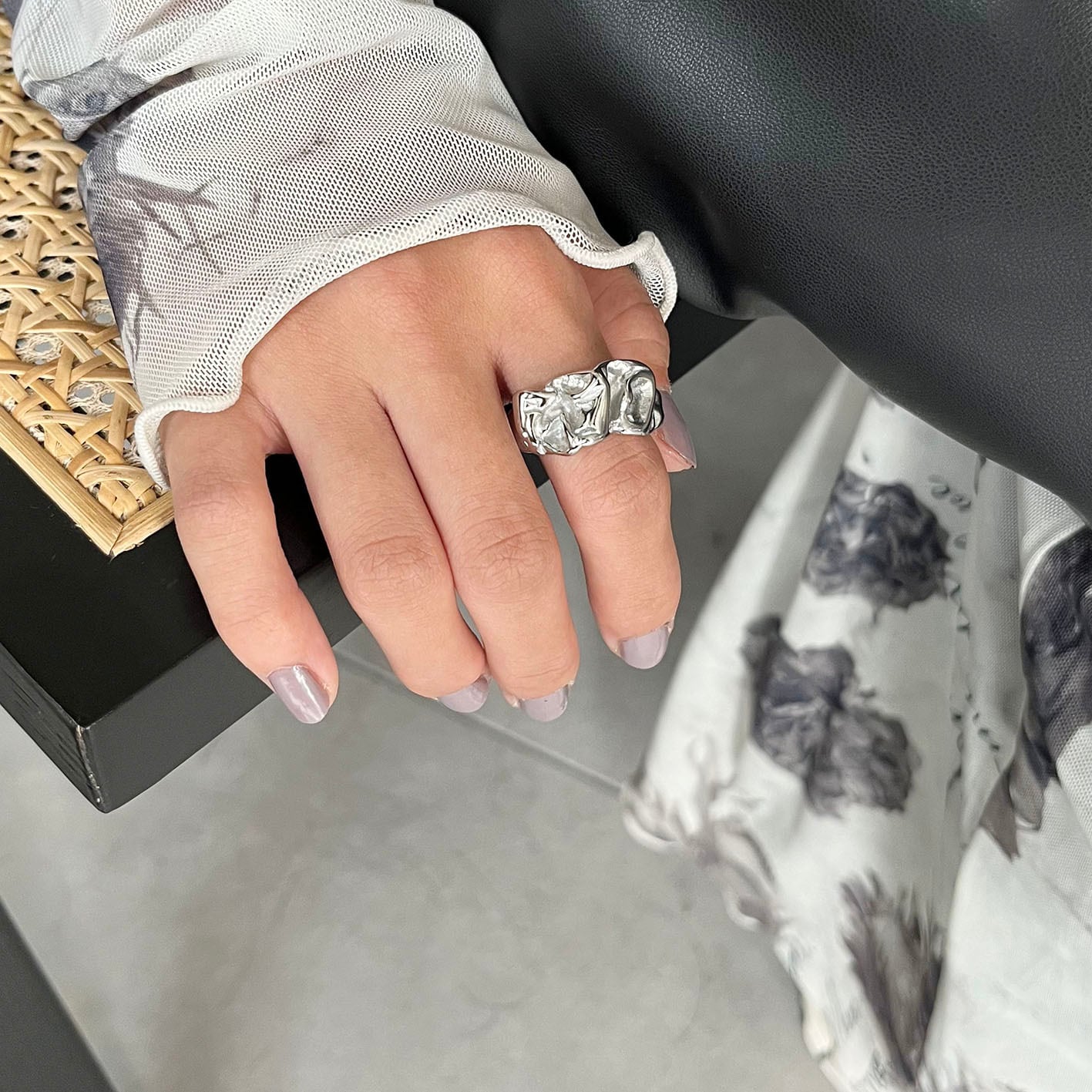 くしゃっとしたようなデザインのステンレスリング。1つ付けるだけで印象的でおしゃれなリングです。