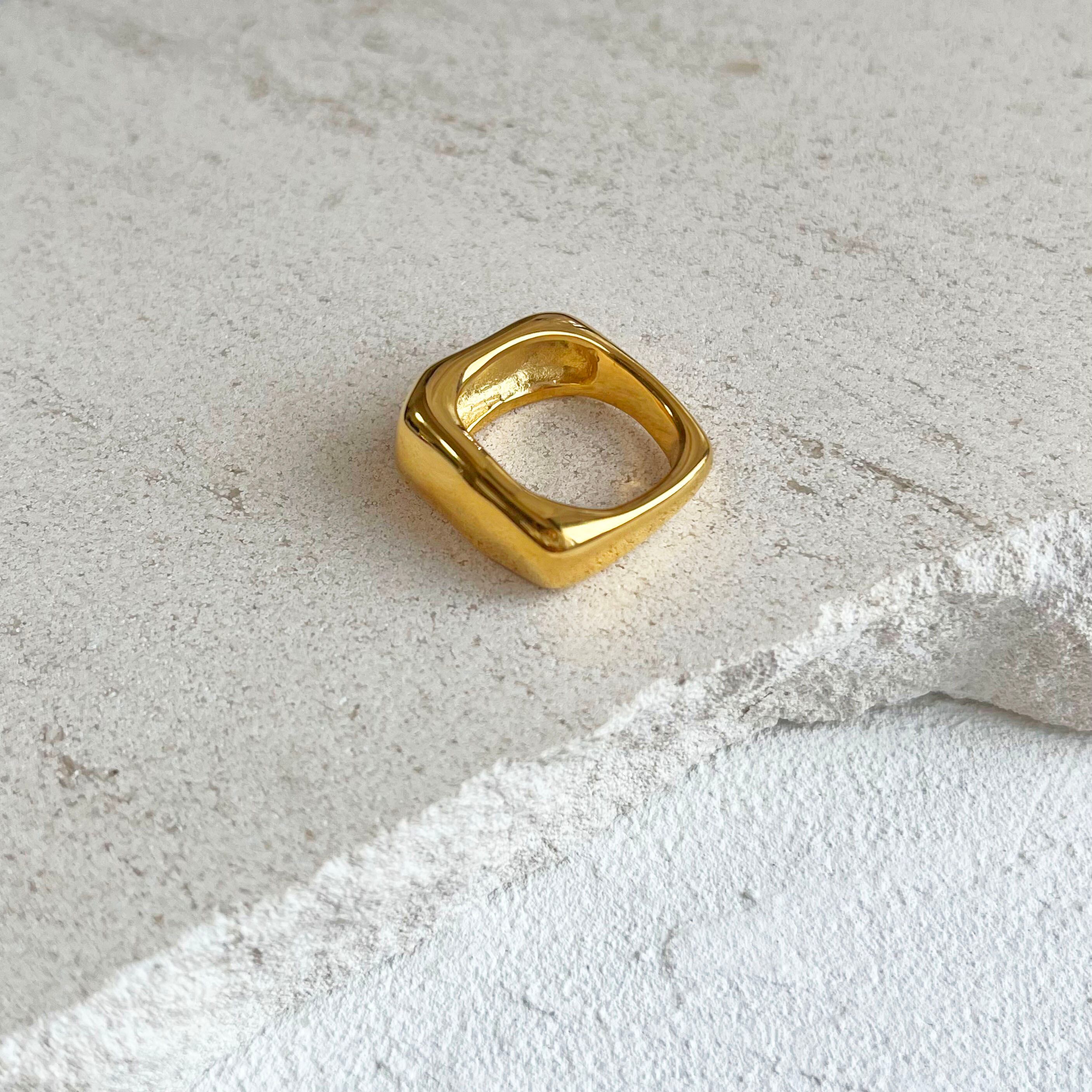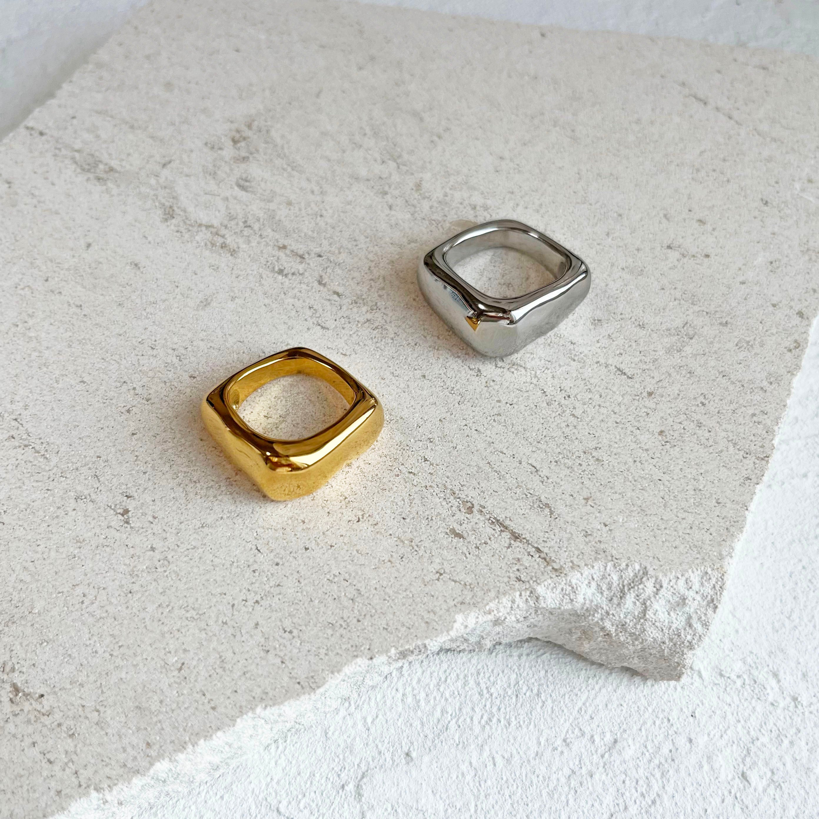 スクエアフォルムに、なめらかな曲線を重ねたアートなリング。