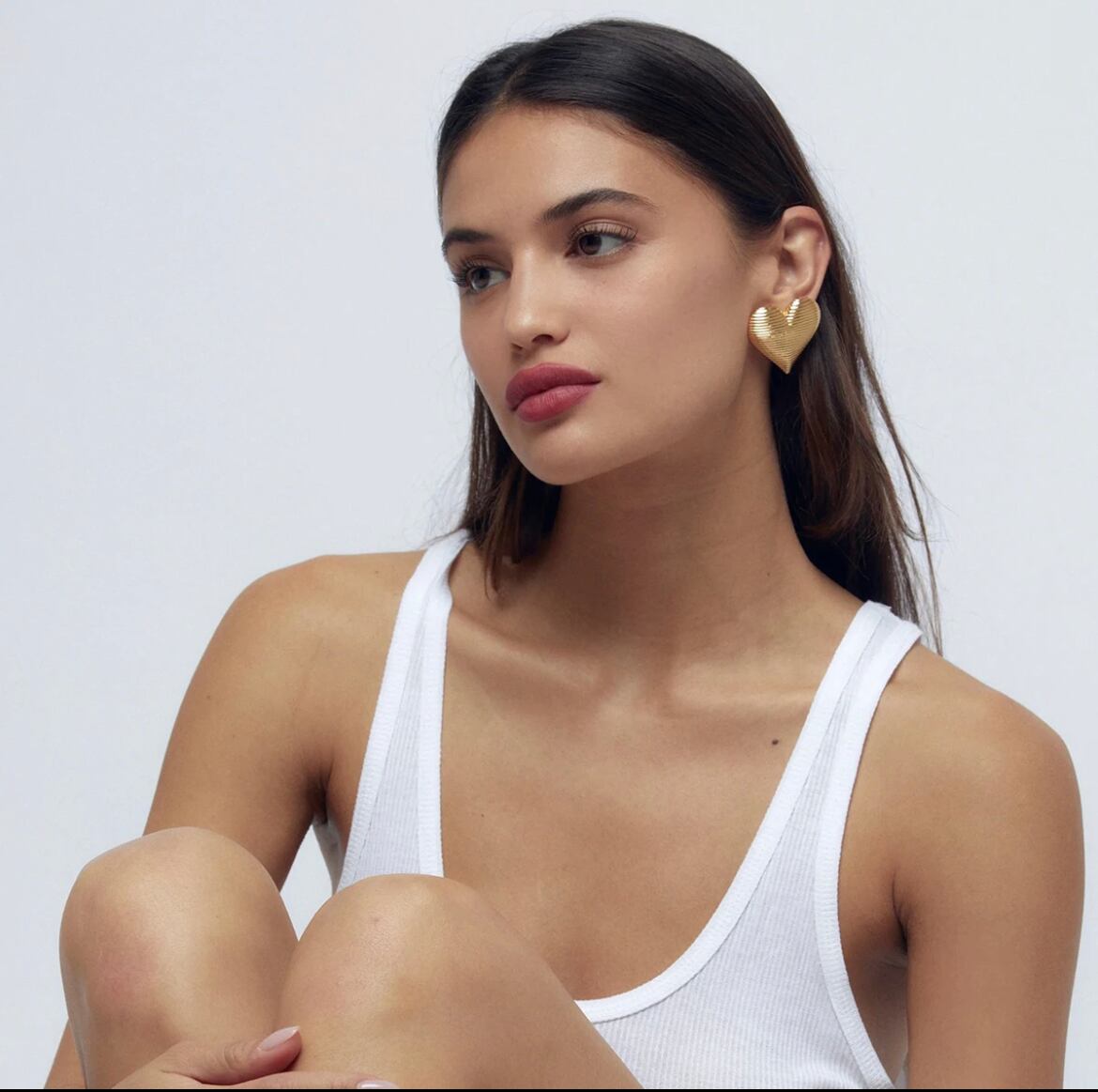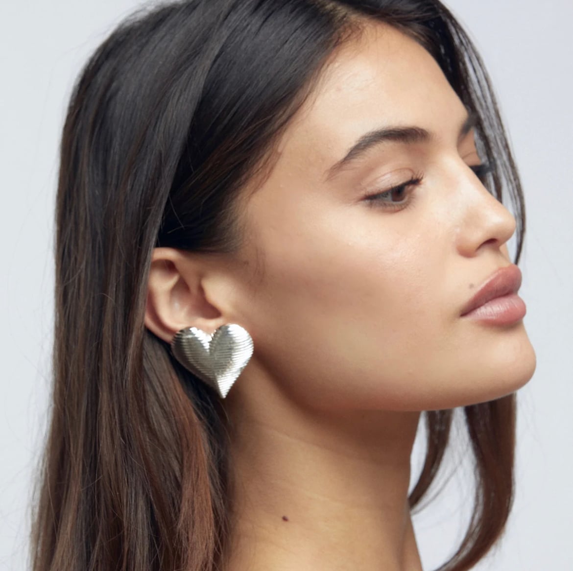 ハート型のステンレスピアス。横に線が入ったテクスチャーでチョコレートみたいなかわいいデザインです。ハートの形もぷっくりと可愛く厚みもあり高級感のあるステンレスピアスです。