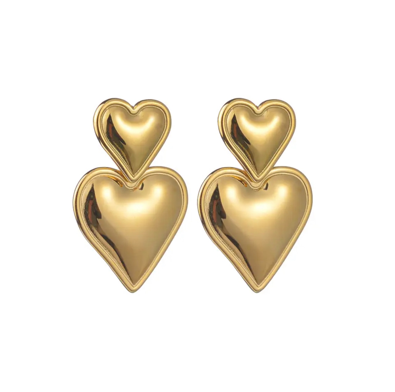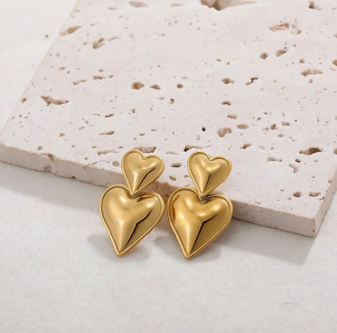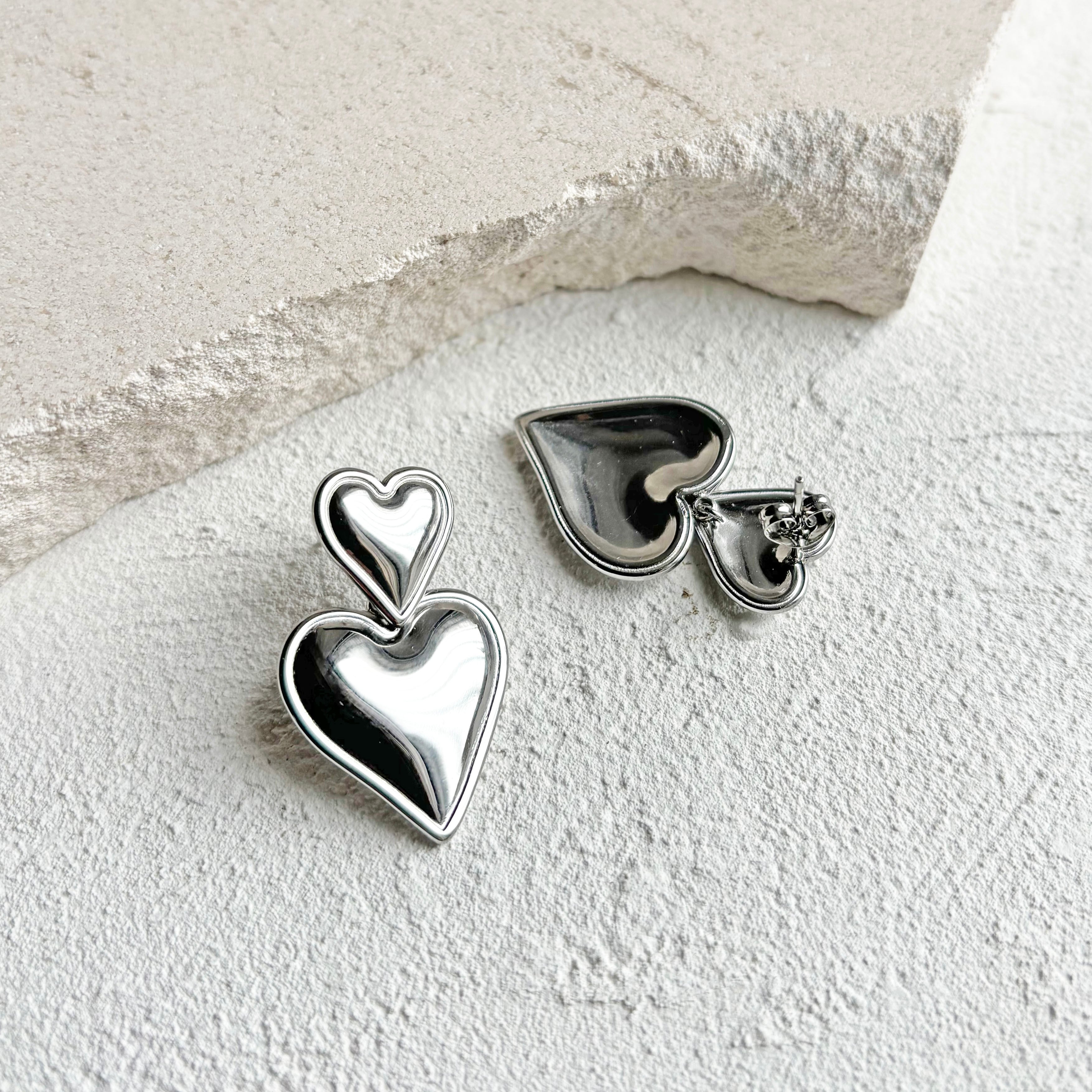 ハート型のステンレスピアス。上下に分かれていて下のハートが揺れるデザインになっています。薄めの作りでとても軽く着けやすいステンレスピアスです。
