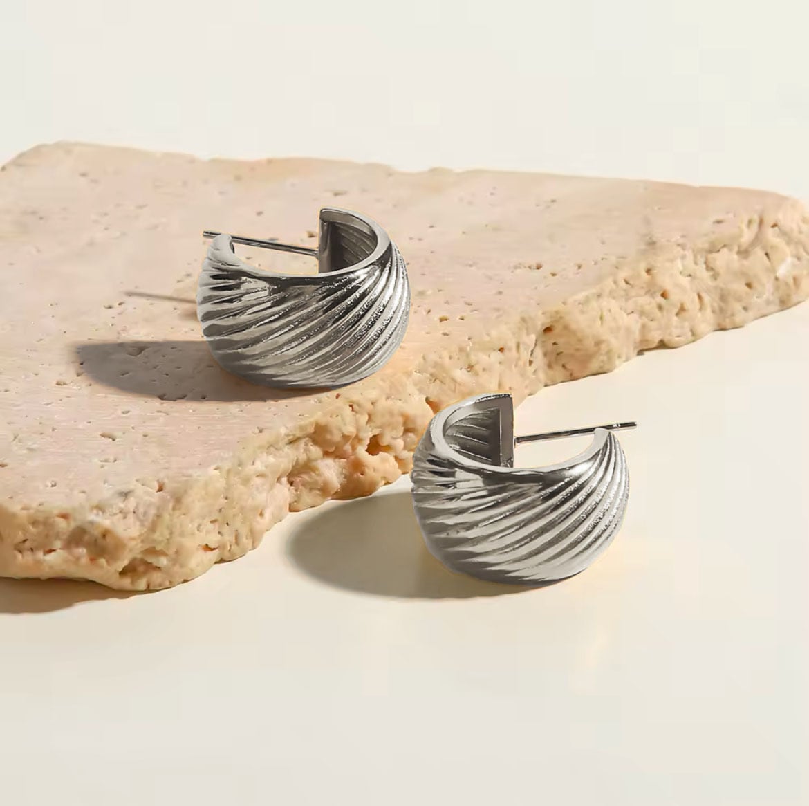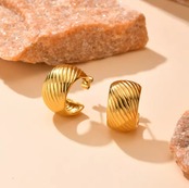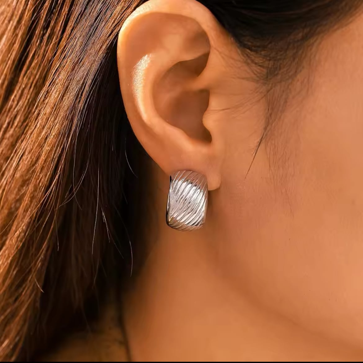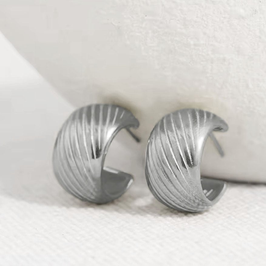 模様の入ったフープのステンレスピアス。シンプルだけど、幅が広めなのでコロンとして大人っぽく、サイズ感もちょうど良い。どんなファッションにも合うデザインです。