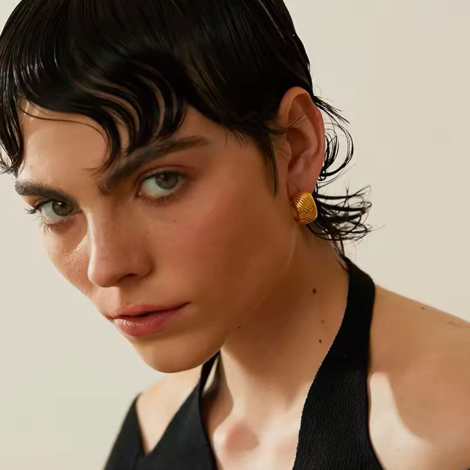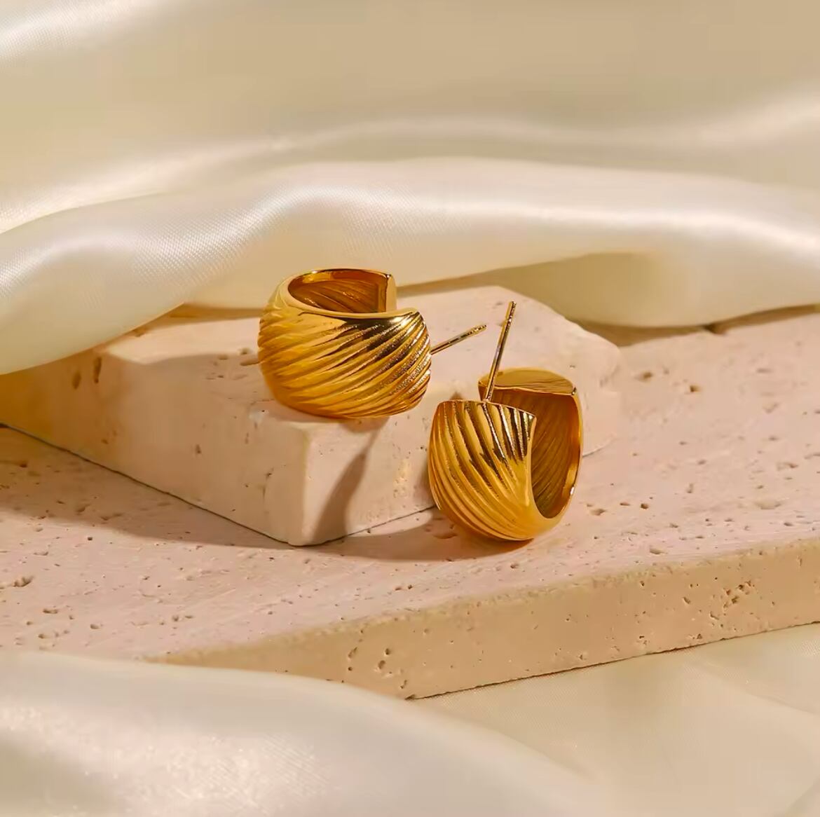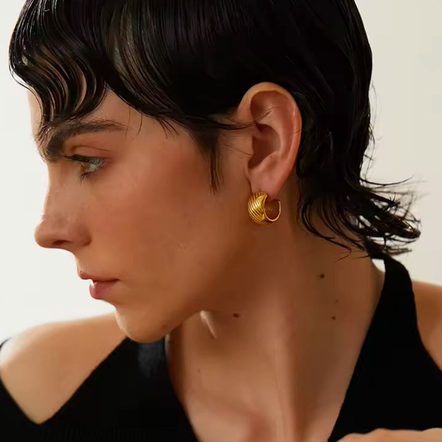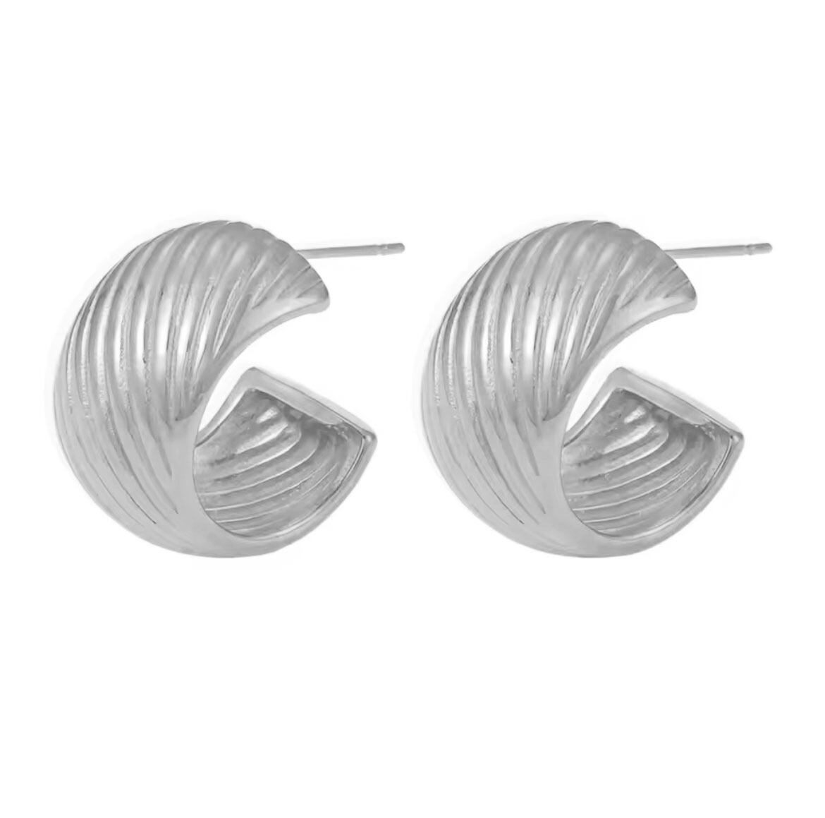 模様の入ったフープのステンレスピアス。シンプルだけど、幅が広めなのでコロンとして大人っぽく、サイズ感もちょうど良い。どんなファッションにも合うデザインです。